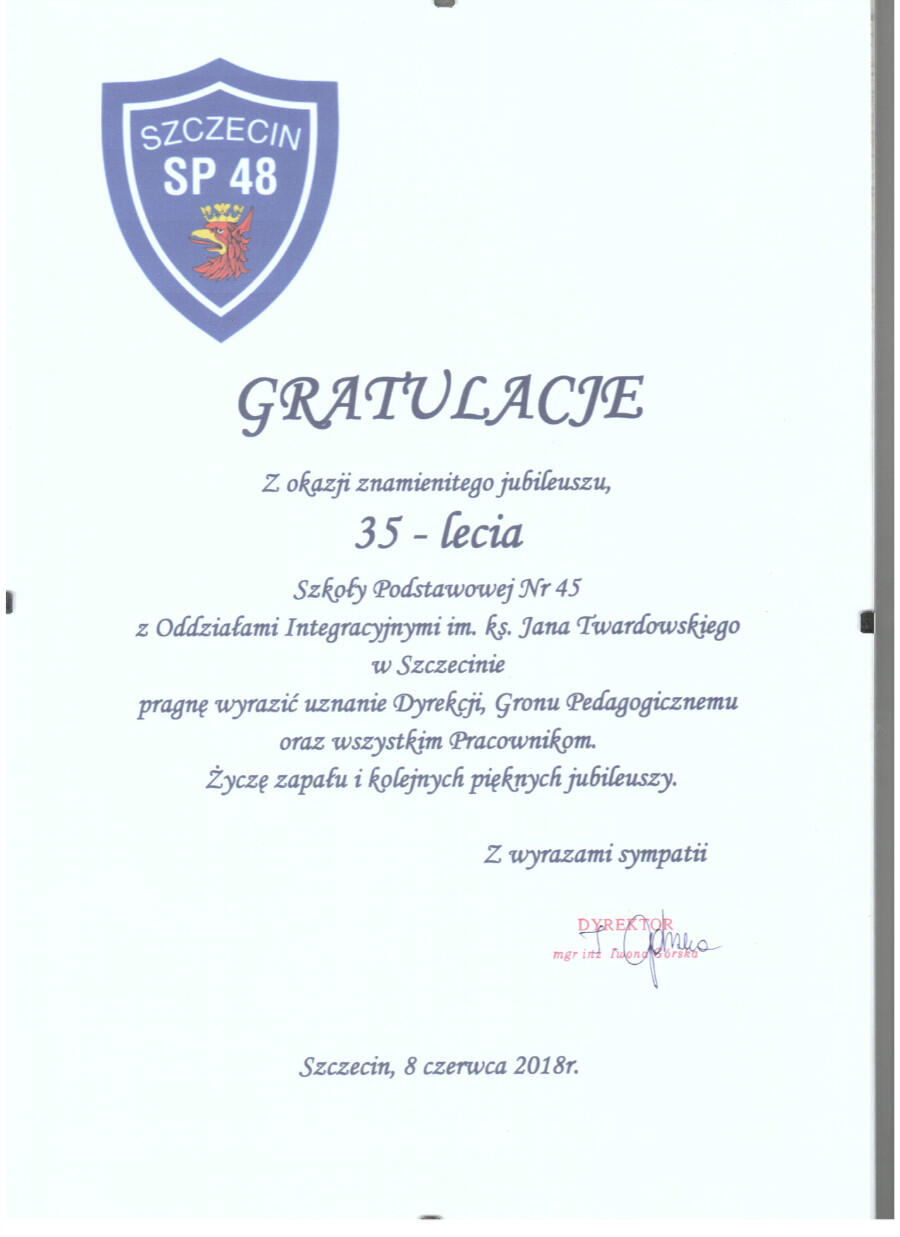 8 czerwca 2018r w naszej szkole świętowaliśmy jubileusz 35-lecia. Obchody rozpoczęliśmy od uroczystej mszy świętej. Następnie odbył się apel na boisku szkolnym z udziałem całej społeczności uczniowskiej w trakcie, którego z rąk dzieci poleciały białe i czerwone balony. Dla uczniów Rada Rodziców przygotowała słodki poczęstunek.