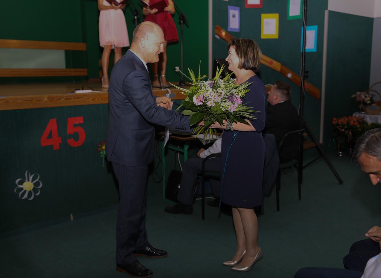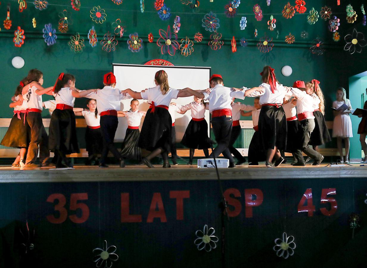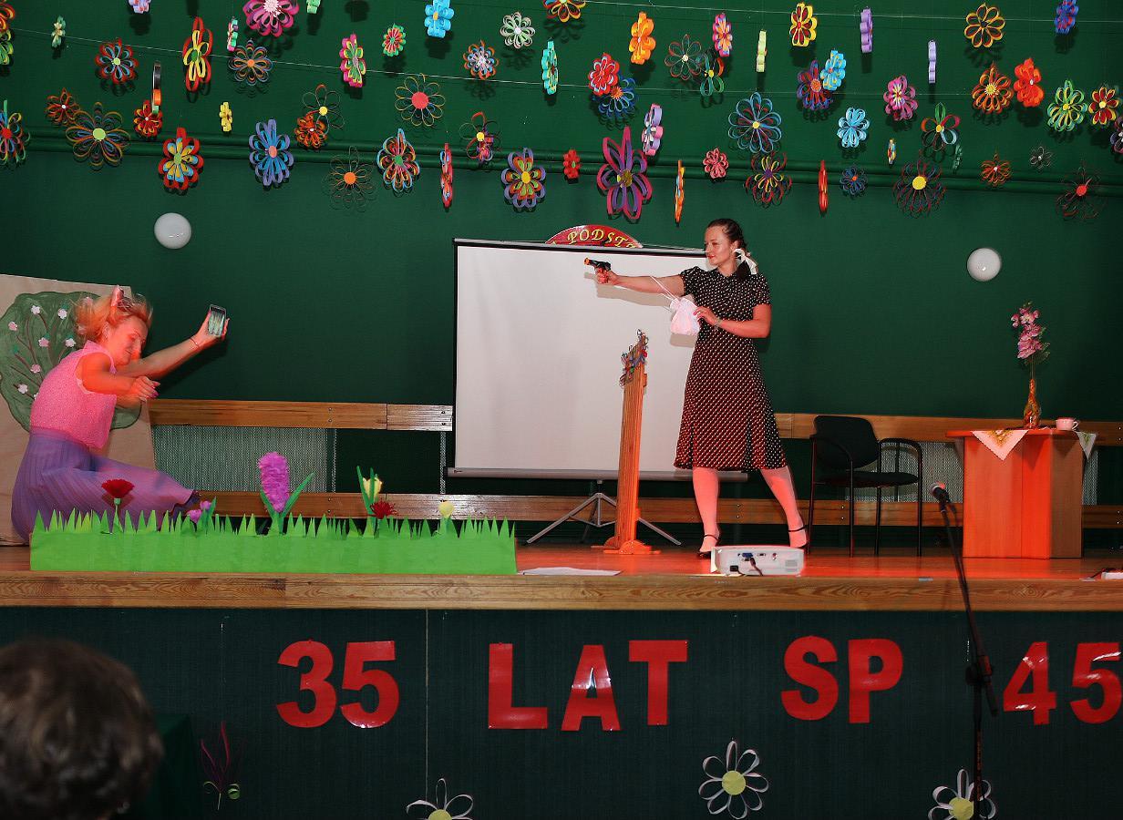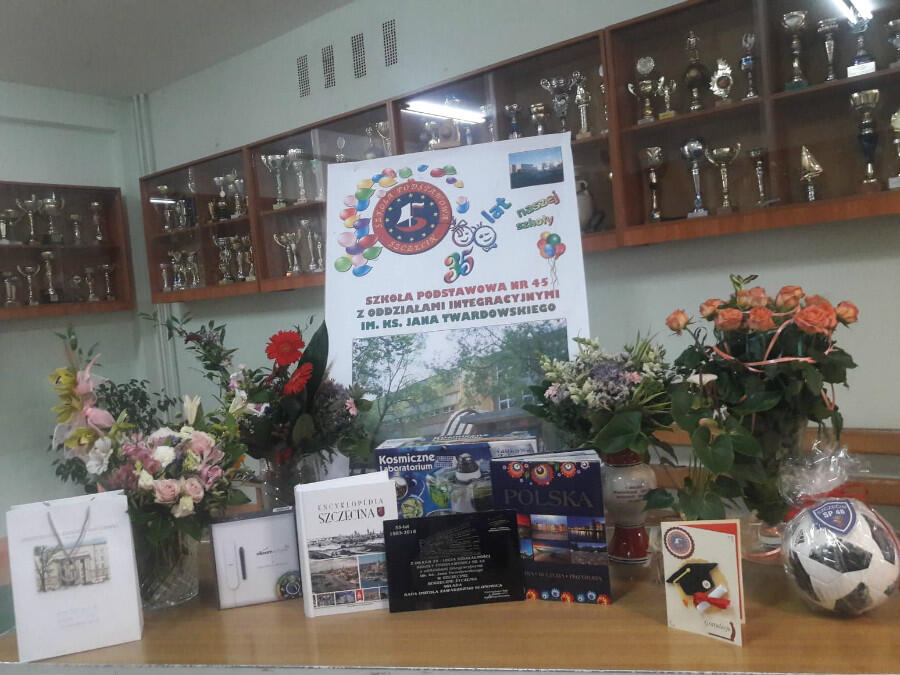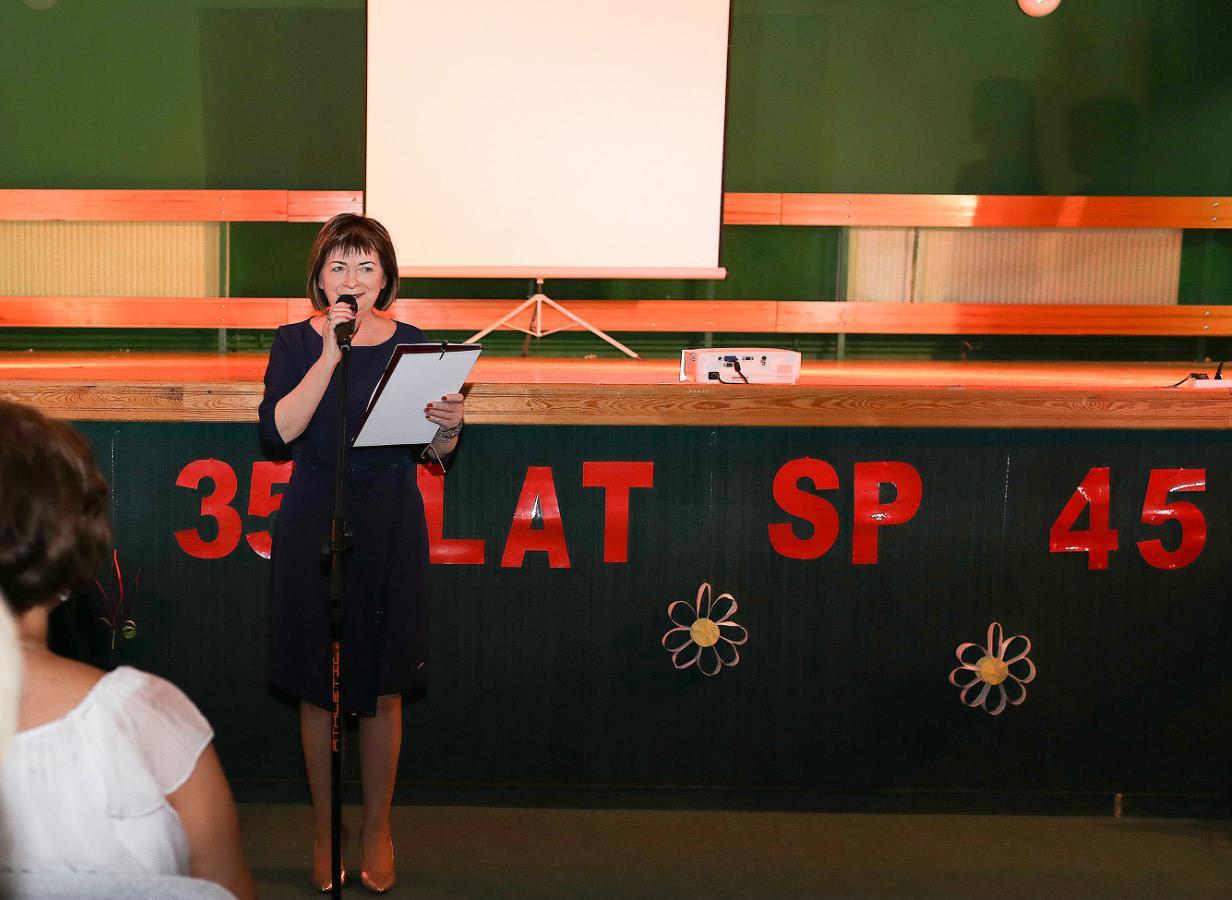 O godzinie 11 rozpoczęła się oficjalna część uroczystości z udziałem zaproszonych gości i absolwentów szkoły. Na początku głos zabrała p. dyrektor Gabriela Renkiewicz, a następnie zaproszeni goście: Prezydent Miasta Szczecin p. Piotr Krzystek, Podsekretarz Stanu w Ministerstwie Edukacji Narodowej p. Maciej Kopeć, Zachodniopomorski Wicekurator Oświaty p. Jerzy Sołtysiak. W trakcie akademii została zaprezentowana krótka historia SP45, wręczono statuetki pani Lucynie Rajkowskiej i pani Annie Snarskiej, które pracują w naszej szkole od początku jej istnienia, oraz wyjątkowym absolwentom. Nasi uczniowie uświetnili jubileusz tańcami i śpiewem. W ramach niespodzianki nauczyciele nasze szkoły przedstawili współczesną wersję Balladyny. Po oficjalnej części wszyscy przybyli udali się na poczęstunek i rozmowy przy kawie.