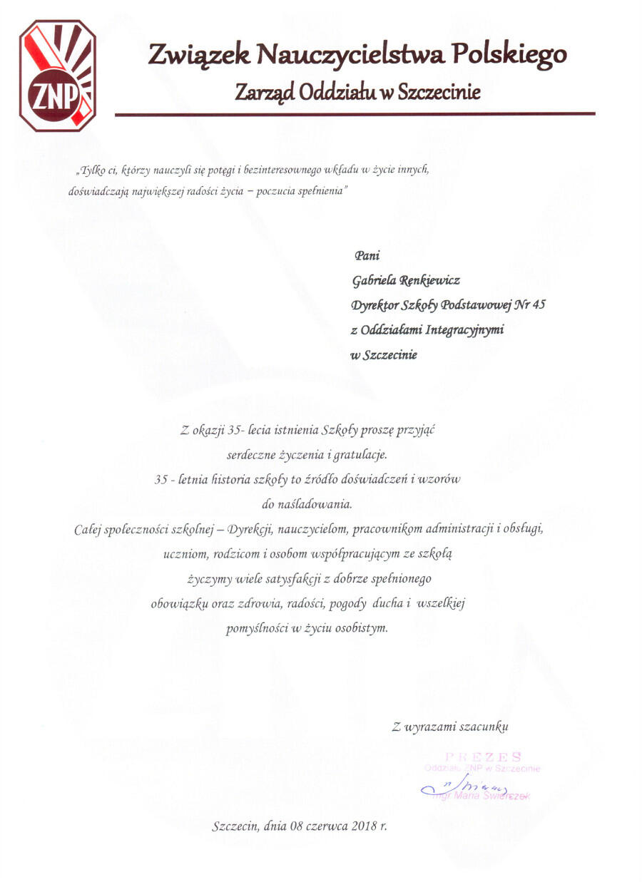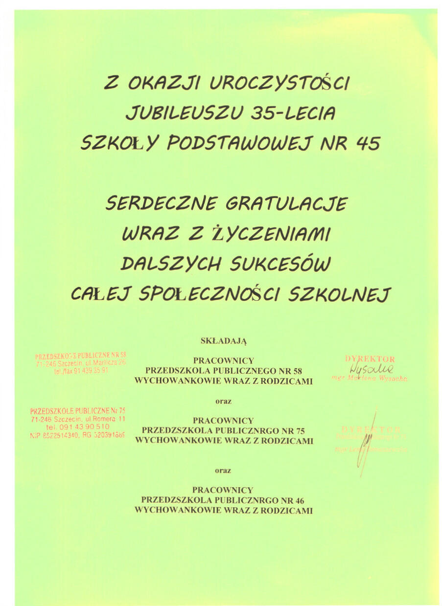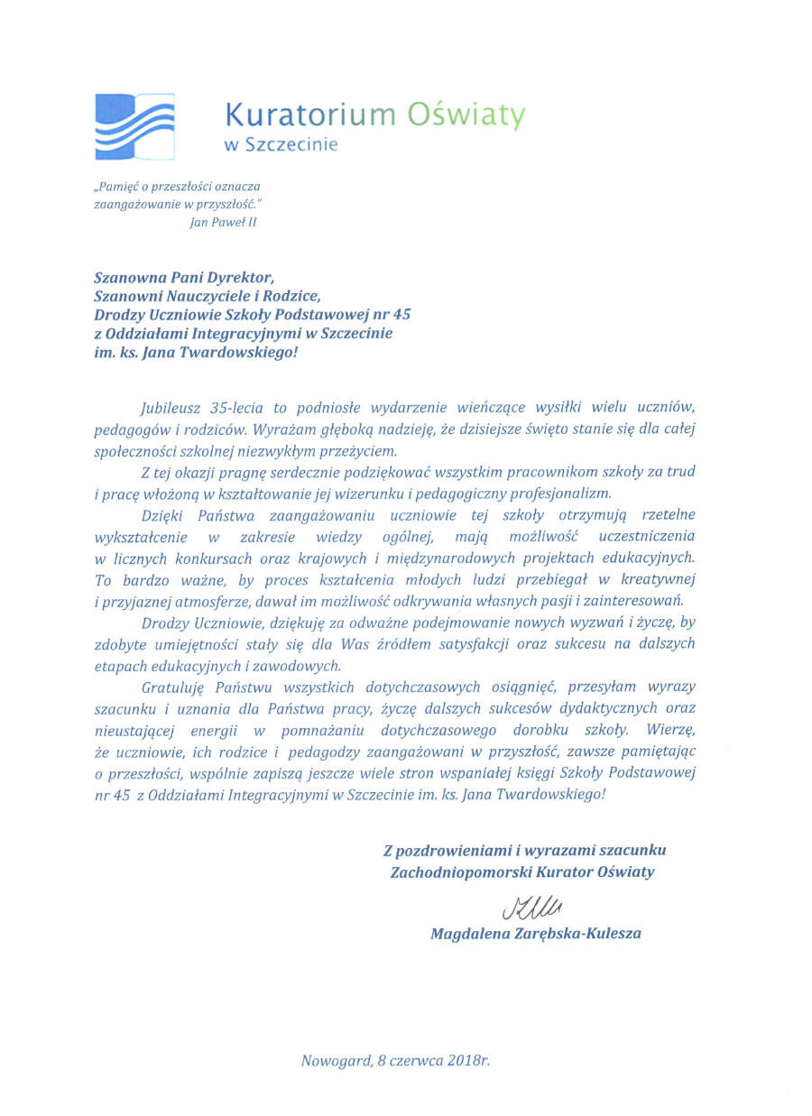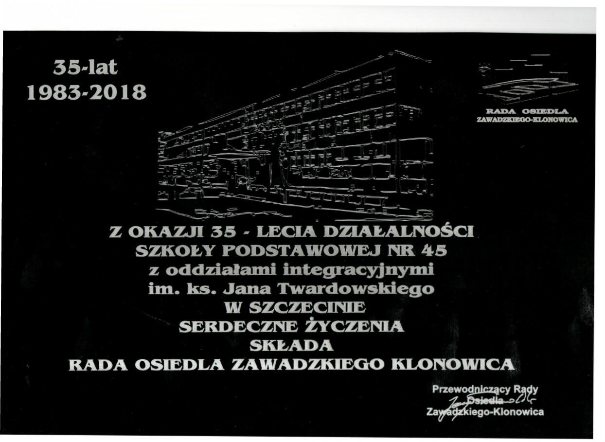 O godzinie 11 rozpoczęła się oficjalna część uroczystości z udziałem zaproszonych gości i absolwentów szkoły. Na początku głos zabrała p. dyrektor Gabriela Renkiewicz, a następnie zaproszeni goście: Prezydent Miasta Szczecin p. Piotr Krzystek, Podsekretarz Stanu w Ministerstwie Edukacji Narodowej p. Maciej Kopeć, Zachodniopomorski Wicekurator Oświaty p. Jerzy Sołtysiak. W trakcie akademii została zaprezentowana krótka historia SP45, wręczono statuetki pani Lucynie Rajkowskiej i pani Annie Snarskiej, które pracują w naszej szkole od początku jej istnienia, oraz wyjątkowym absolwentom. Nasi uczniowie uświetnili jubileusz tańcami i śpiewem. W ramach niespodzianki nauczyciele nasze szkoły przedstawili współczesną wersję Balladyny. Po oficjalnej części wszyscy przybyli udali się na poczęstunek i rozmowy przy kawie.