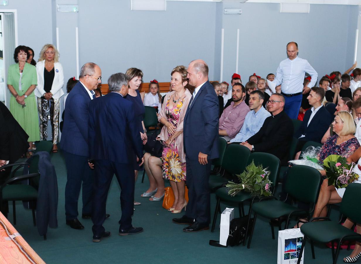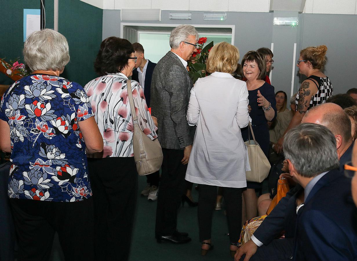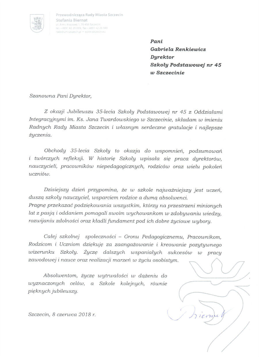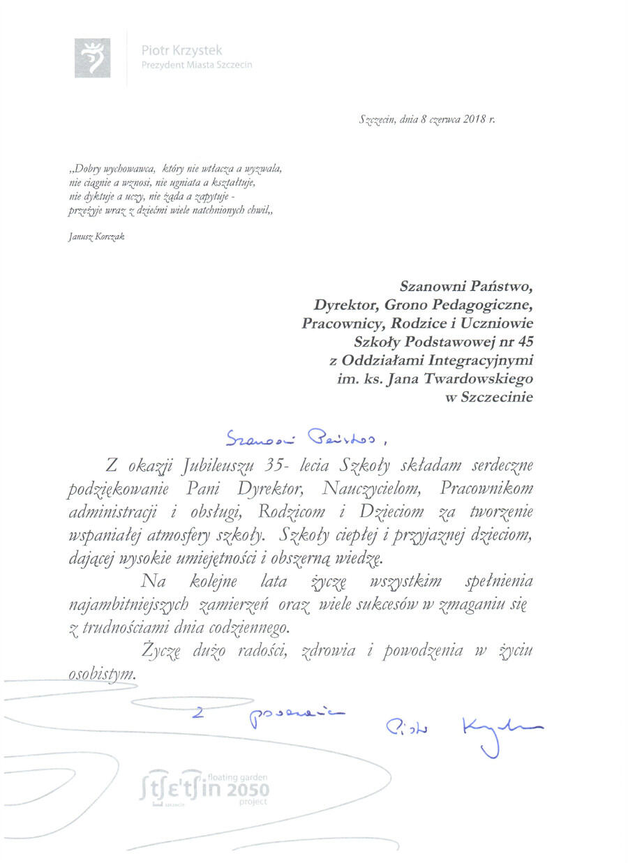 O godzinie 11 rozpoczęła się oficjalna część uroczystości z udziałem zaproszonych gości i absolwentów szkoły. Na początku głos zabrała p. dyrektor Gabriela Renkiewicz, a następnie zaproszeni goście: Prezydent Miasta Szczecin p. Piotr Krzystek, Podsekretarz Stanu w Ministerstwie Edukacji Narodowej p. Maciej Kopeć, Zachodniopomorski Wicekurator Oświaty p. Jerzy Sołtysiak. W trakcie akademii została zaprezentowana krótka historia SP45, wręczono statuetki pani Lucynie Rajkowskiej i pani Annie Snarskiej, które pracują w naszej szkole od początku jej istnienia, oraz wyjątkowym absolwentom. Nasi uczniowie uświetnili jubileusz tańcami i śpiewem. W ramach niespodzianki nauczyciele nasze szkoły przedstawili współczesną wersję Balladyny. Po oficjalnej części wszyscy przybyli udali się na poczęstunek i rozmowy przy kawie.