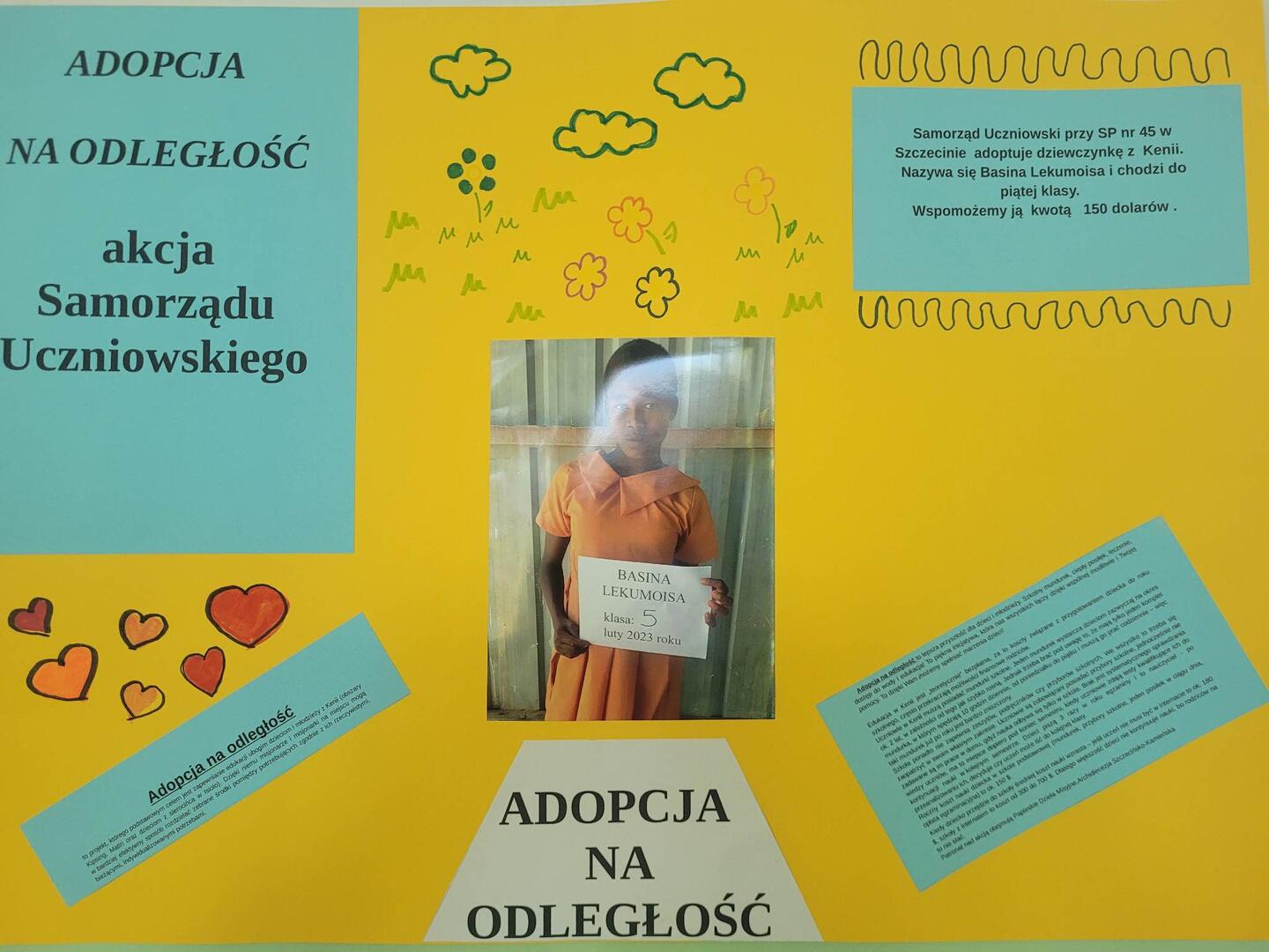 Adopcja na odległość to projekt, którego podstawowym celem jest zapewnianie edukacji ubogim dzieciom i młodzieży z Kenii . Roczny koszt nauki dziecka w szkole podstawowej (mundurek, przybory szkolne, jeden posiłek w ciągu dnia, opłata egzaminacyjna) to ok. 150 $. Samorząd Uczniowski pod patronatem archidiecezji Szczecińsko-Kamieńskiej w tym roku realizuje własnie taki projekt. Nauczyciele odpowiedzialni za to działanie w naszej szkole to p. M.Ankudowicz, p. J.Schmidt oraz p. D.Spych. Nasi uczniowie pomagają dziewczynce, która nazywa się Basina Lekumoisa i uczęszcza 5 do klasy. Środki pozyskujemy z kiermaszów ciast i galaretek przygotowanych przez rodziców oraz dzieci naszej szkoły. Podczas lekcji religii uwrażliwiamy uczniów na biedę i potrzeby ich rówieśników z Kenii. Adopcja na odległość ma na celu danie tym dzieciom nadziei na lepsze jutro.