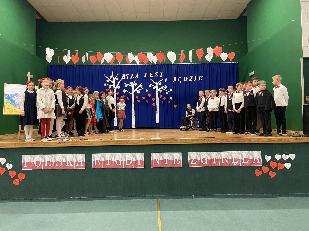 Dnia 8 listopada 2024 r. w naszej szkole odbyła się uroczysta akademia z okazji Święta Niepodległości przygotowana przez uczniów klasy 3a oraz 3d integracyjnej, na którą zaproszono wszystkich uczniów naszej szkoły. Uroczystość rozpoczęła się od odśpiewania hymnu "Mazurek Dąbrowskiego", a przygotowany program był bogaty w pieśni patriotyczne oraz wiersze. Uroczystość ta z pewnością zapadnie wszystkim głęboko w pamięci. Dzień, który przeżyliśmy dumnie i z uśmiechem na twarzy, na pewno przyczyni się do kształtowania patriotycznych postaw naszych uczniów.