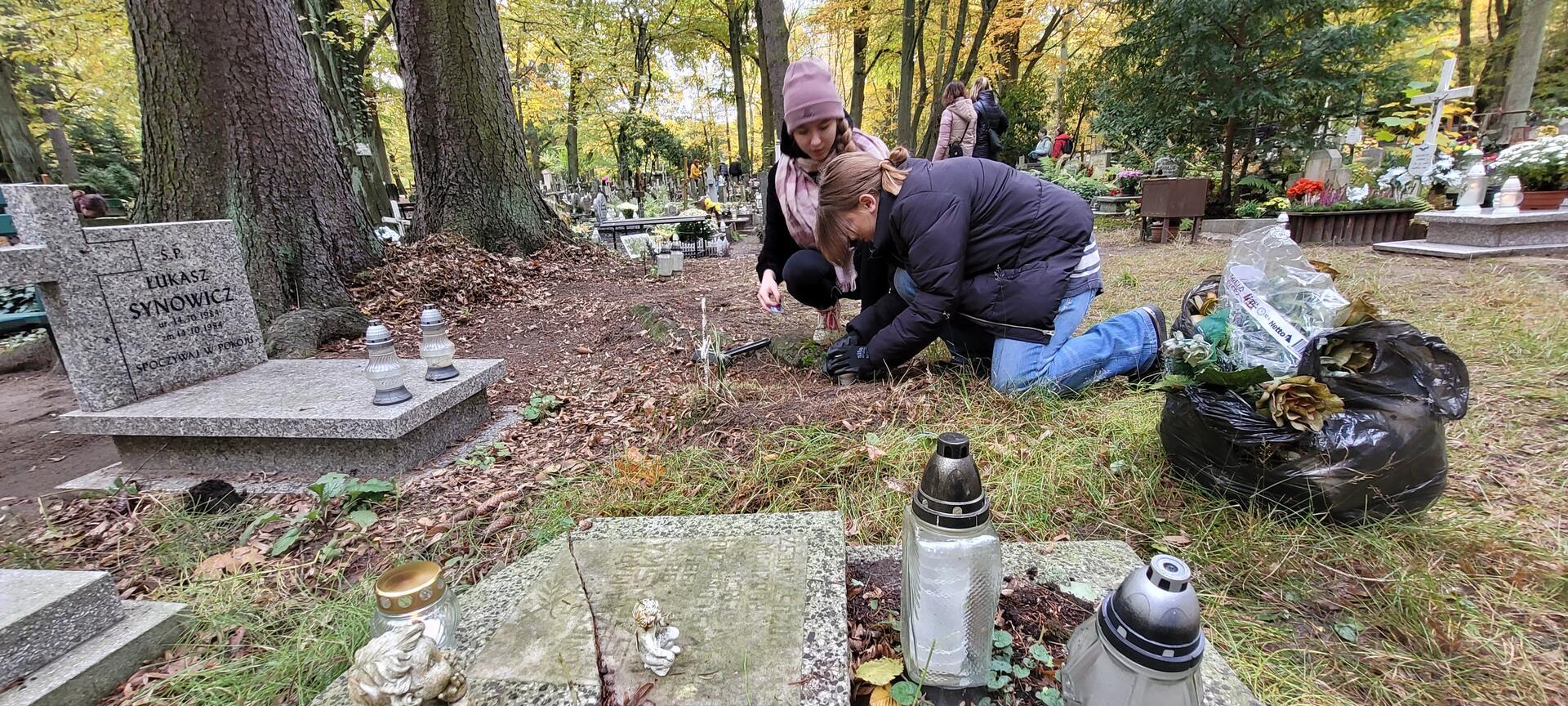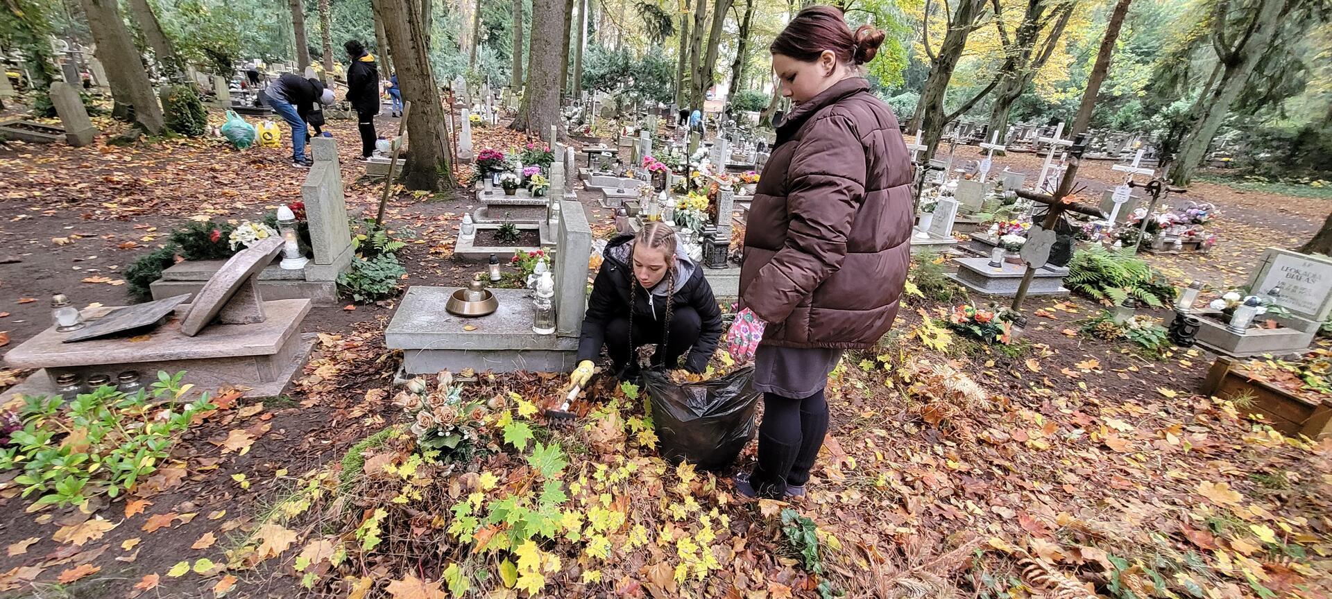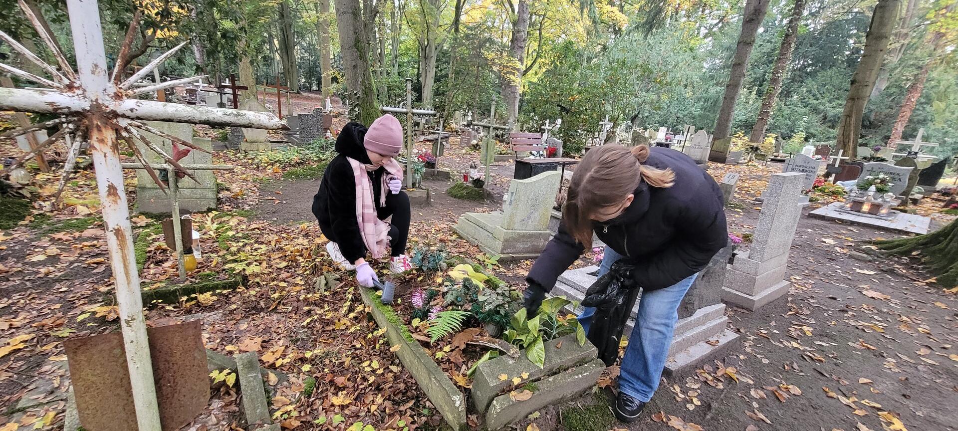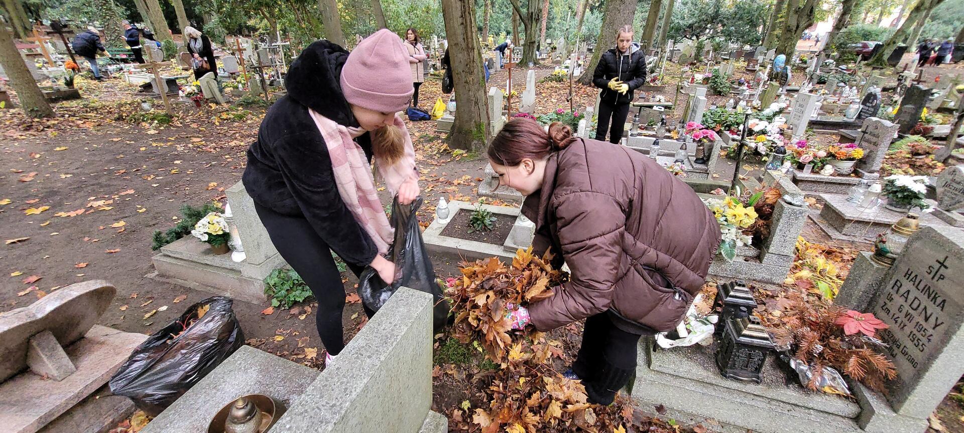 W sobotę, 28 października wolontariusze z naszego Szkolnego Koła Wolontariatu, jak co roku spotkali się na Cmentarzu Centralnym w Szczecinie, gdzie porządkowali groby w kwaterze dziecięcej. Swoją uwagę skupili przede wszystkim na tych najbardziej zaniedbanych, często najstarszych i już bezimiennych. Do pracy przystąpili zaopatrzeni w rękawiczki, worki, grabie i inny potrzebny sprzęt. Na uporządkowanych grobach zapalili znicze, zebrane wcześniej przez Samorząd Uczniowski. Te małe groby i pomniki, czasami tylko krzyże z metalu lub z drewna, tabliczki z datami urodzin i śmierci wzbudziły bardzo silne emocje. Śmierć jest częścią życia każdego człowieka, ale trudno z nią się pogodzić, zwłaszcza jeśli dotyczy dziecka.