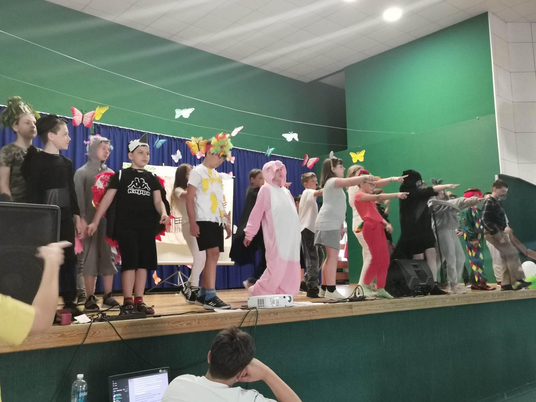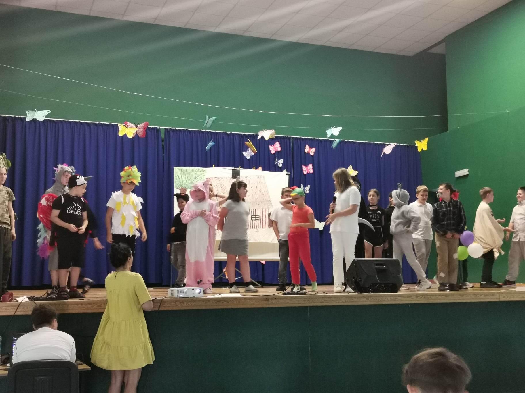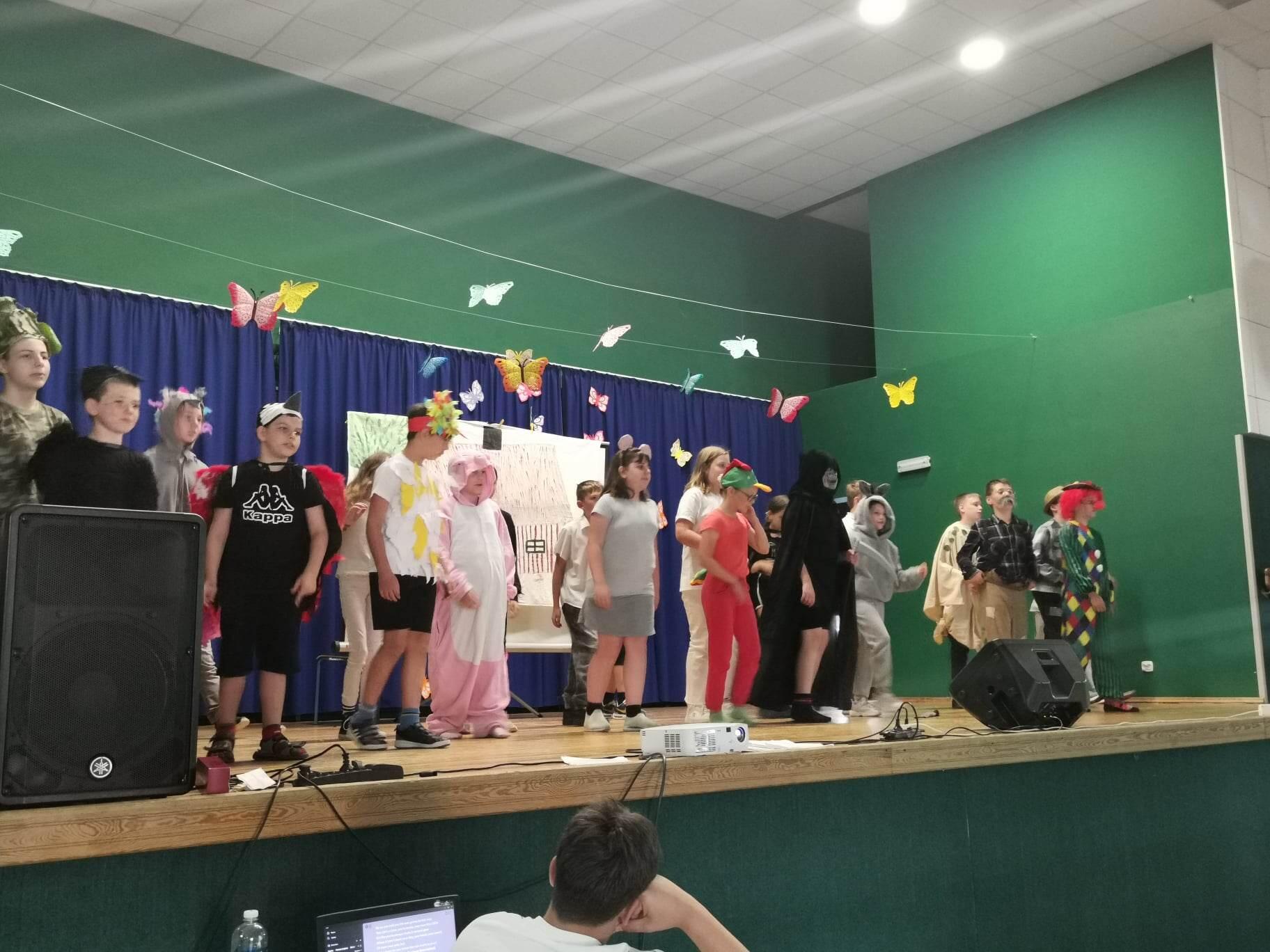 Spektakl klasy 4a okazał się nie lada wyzwaniem. Mogliśmy podziwiać niesamowitą grę aktorską,choreografię , śpiew,ale przede wszystkim usłyszeć kwestie obcojęzyczne,bowiem znalazły się tu wydźwięki w języku polskim, angielskim, niemieckim i ukraińskim. Nasi młodzi aktorzy zaprezentowali również wspaniałe stroje,które swoimi kolorami dopełniły całości.