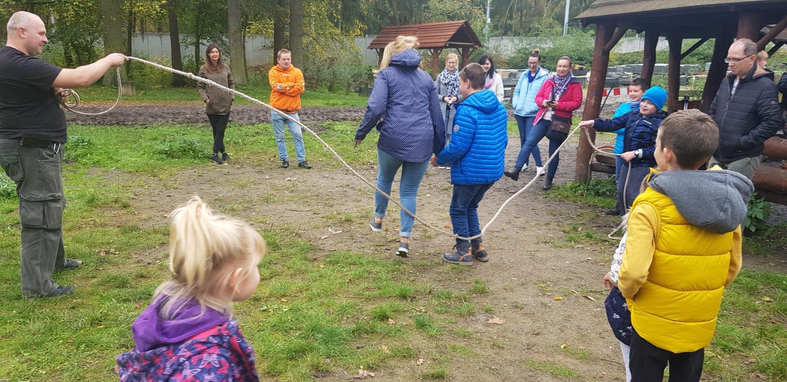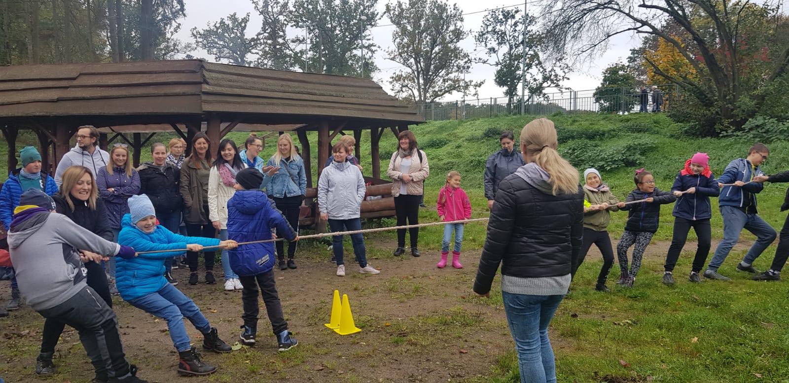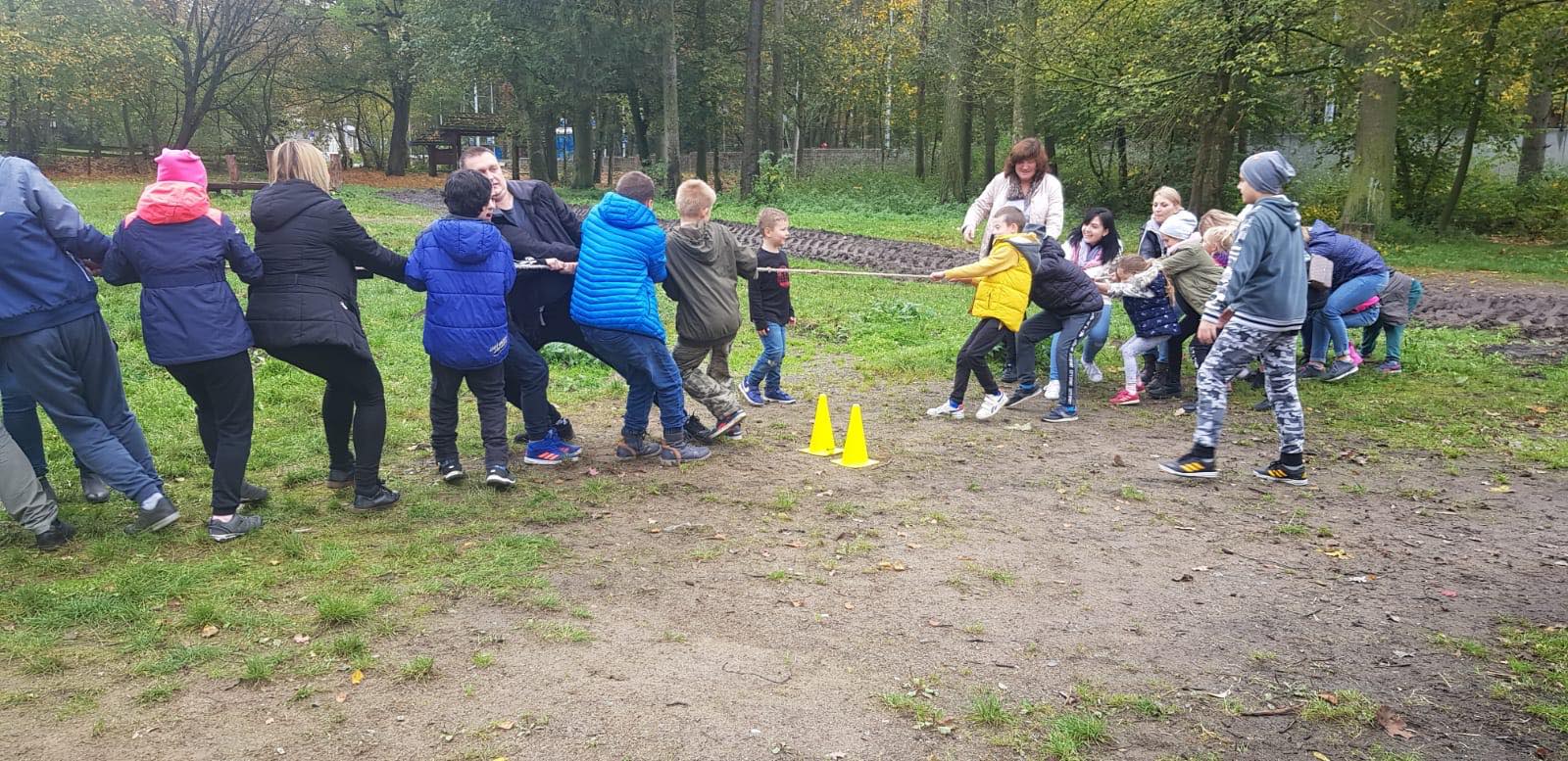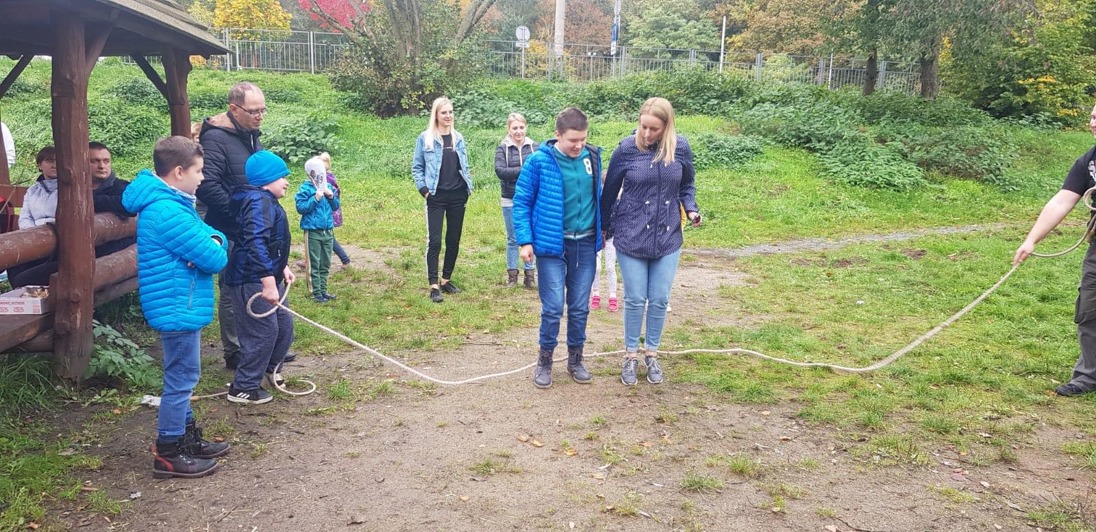 Ognisko zostało rozpoczęte w sportowym stylu. Grono rodziców, nauczycieli i uczniów wzięło udział w nordicwalkingu. W jesiennej scenerii na Czerwonej Polanie przy Arkonce uczniowie, rodzice i nauczyciele piekli wspólnie kiełbaski na ognisku. Następnie wszyscy razem chętnie uczestniczyli w zabawach integracyjnych. Do wykonania był szereg różnych konkurencji m.in. przeciąganie liny, skakanie przez wielką skakankę, rzucanie woreczkiem do celu. Wspólne gry i zabawy rozwinęły szanse na nawiązanie więzi społecznych. Spotkanie upłynęło w miłej i ciepłej atmosferze, nie było czasu na nudzenie się, a wszystkim dopisywał bardzo dobry humor. Znakomita atmosfera ogniska przyczyniała się do lepszego poznania kolegów i koleżanek. Wyjątkowy nastrój wspólnego spotkania stworzyli rodzice umilając czas dzieciom poprzez duży zestaw baniek oraz pyszne słodkości.