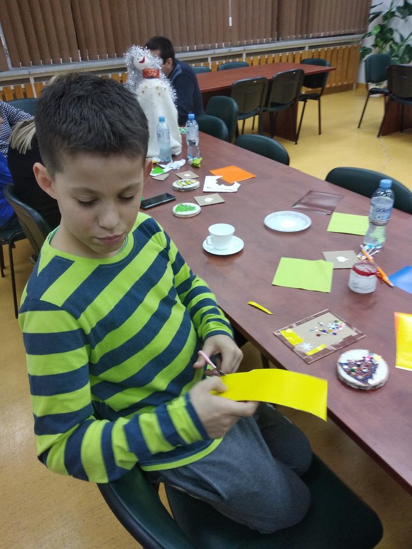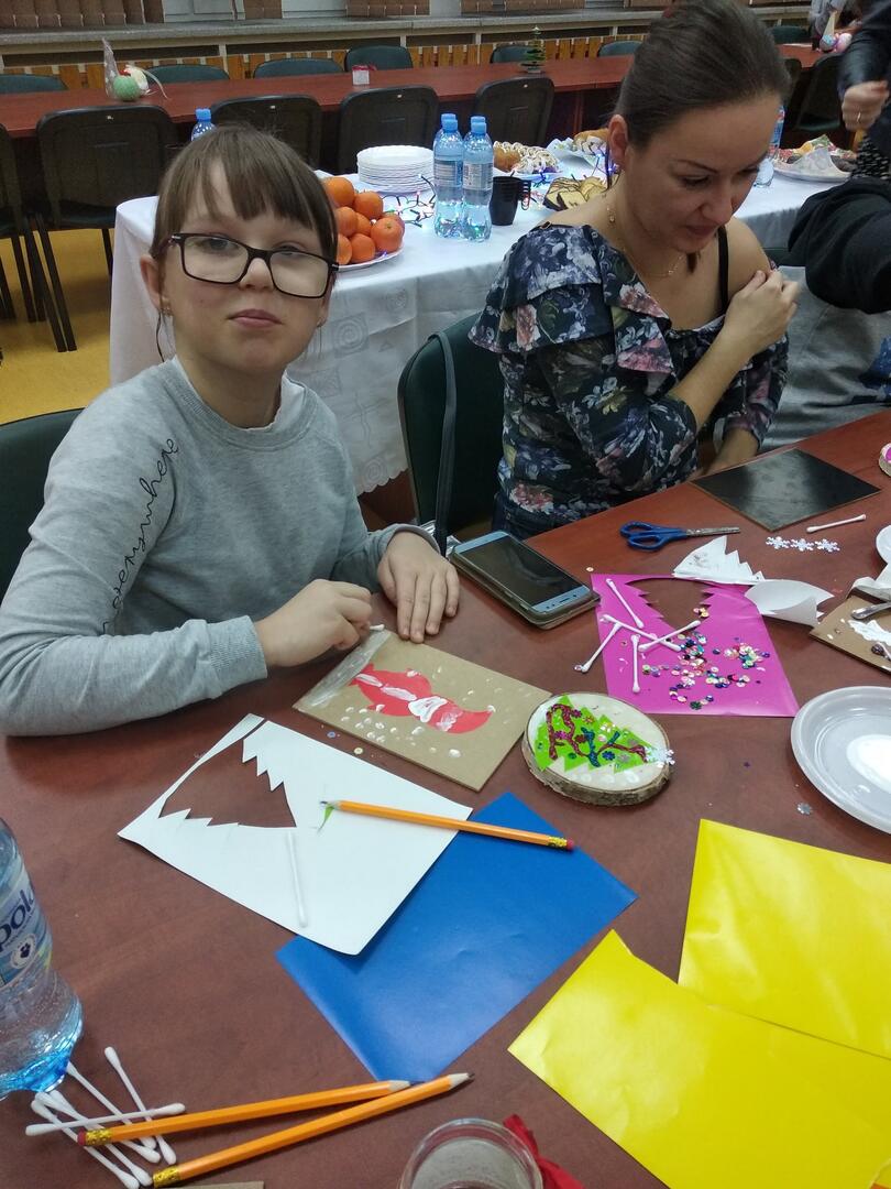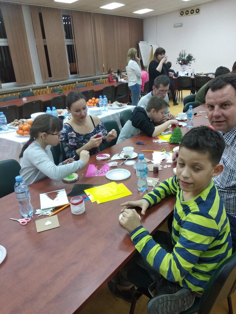 Tuż przed Świętami Bożego Narodzenia w naszej szkole odbyło się drugie spotkanie w ramach Klubiku dla Rodzica. Tym razem staraliśmy się uchwycić „ducha świąt”, które miały niebawem nadejść. O pomoc poprosiliśmy panią Martę Miszuk z Trafostacji Sztuki! Okazało się, że kto jak kto, ale Pani Marta doskonale wiedziała co trzeba zrobić. Przyniosła ze sobą plastry drewna, kleje, farby, kartoniki, cekiny, brokat, wycinanki i POMYSŁ NA ŚWIETNĄ ZABAWĘ! Niektórzy niedowierzali- jak to? Czy to wystarczy by złapać „ducha”? Pani Marta uśmiechała się tylko tajemniczo i zachęcała do pracy. Dlatego wzięliśmy się za wycinanie, klejenie i ozdabianie. Byliśmy ciekawi co się wydarzy. Okazało się, że ile osób tyle pomysłów i jedną rzecz można zrobić na wiele sposobów! I tak przy zaangażowaniu dzieci i rodziców powstały piękne ozdoby świąteczne… Doskonałe na prezent dla najbliższych lub gotowe dekoracje do powieszenia.