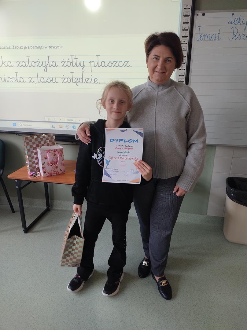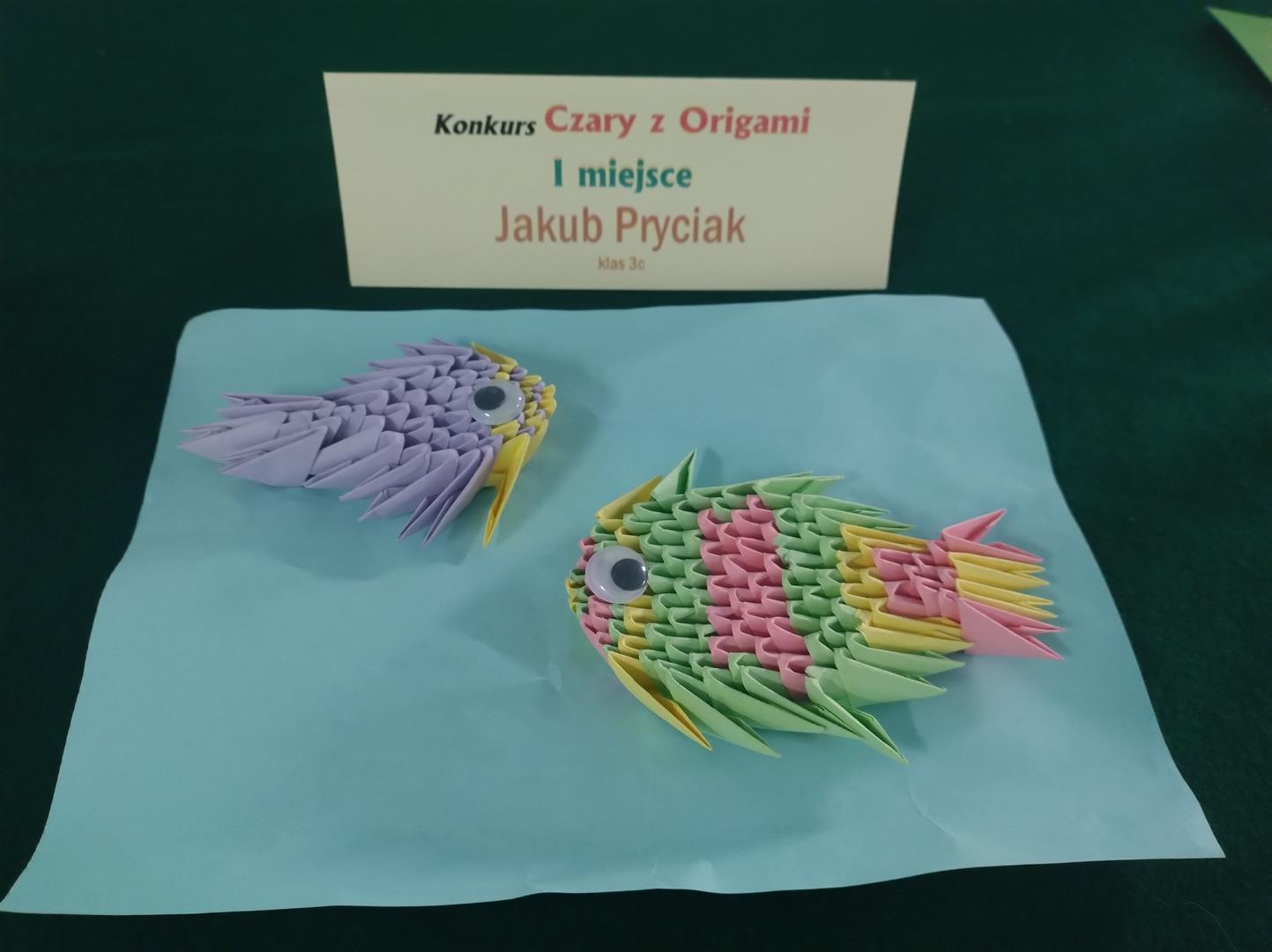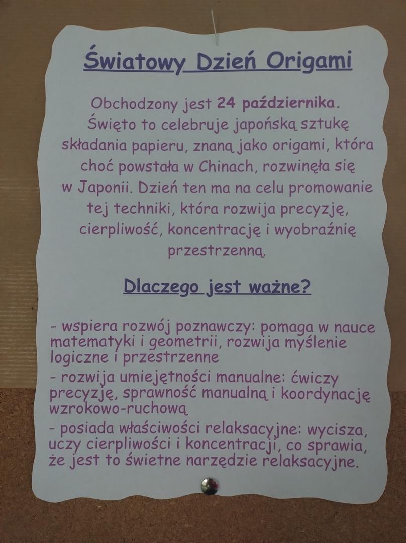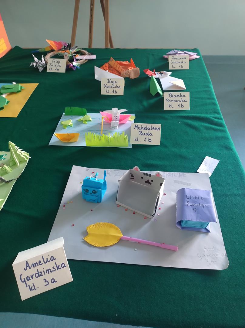 W związku z obchodami Światowego Dnia Origami, w naszej szkole został zorganizowany konkurs "Czary z Origami" dla klas 1-3. Uczniowie podjęli wyzwanie zmierzenia się z wykonaniem prac trudną sztuką składania papieru. Rozwijając wyobraźnię, ćwicząc cierpliwość, dokładność i precyzję stworzyli piękne prace, a komisja konkursowa w składzie p. wicedyr. Iwona Kozak, p. wicedyr. K. Cierkowska - Gendek i p. W. Lewandowska miała trudne zadanie wyłonienia zwycięzców.