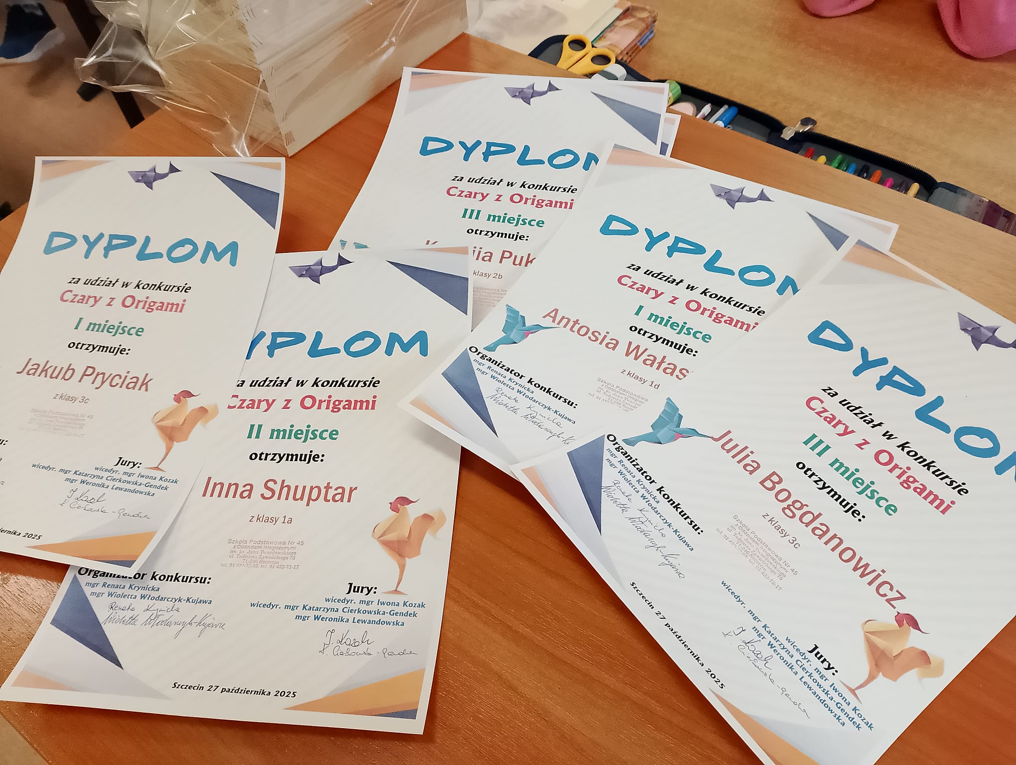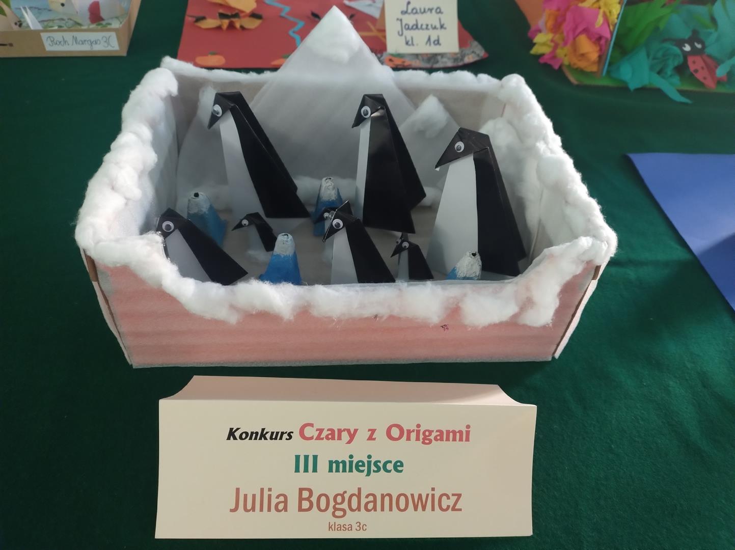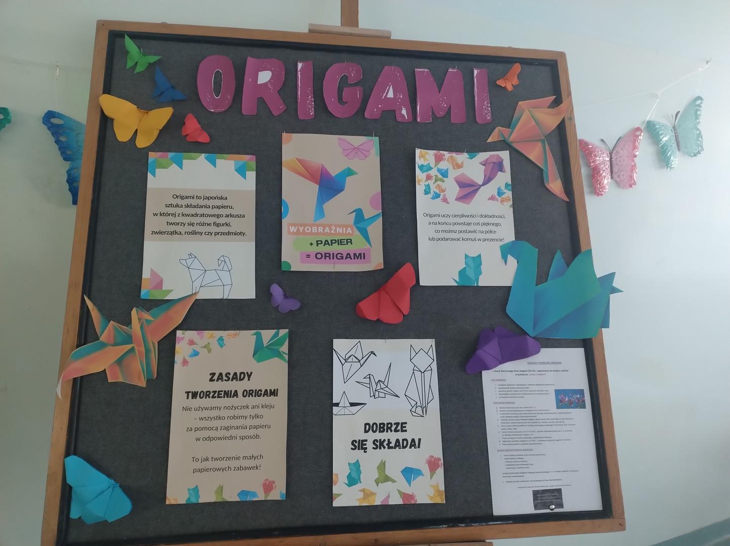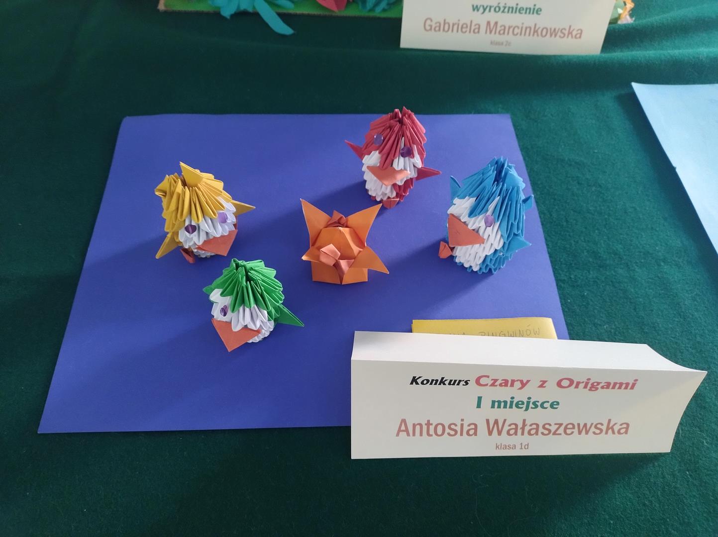 W związku z obchodami Światowego Dnia Origami, w naszej szkole został zorganizowany konkurs "Czary z Origami" dla klas 1-3. Uczniowie podjęli wyzwanie zmierzenia się z wykonaniem prac trudną sztuką składania papieru. Rozwijając wyobraźnię, ćwicząc cierpliwość, dokładność i precyzję stworzyli piękne prace, a komisja konkursowa w składzie p. wicedyr. Iwona Kozak, p. wicedyr. K. Cierkowska - Gendek i p. W. Lewandowska miała trudne zadanie wyłonienia zwycięzców.