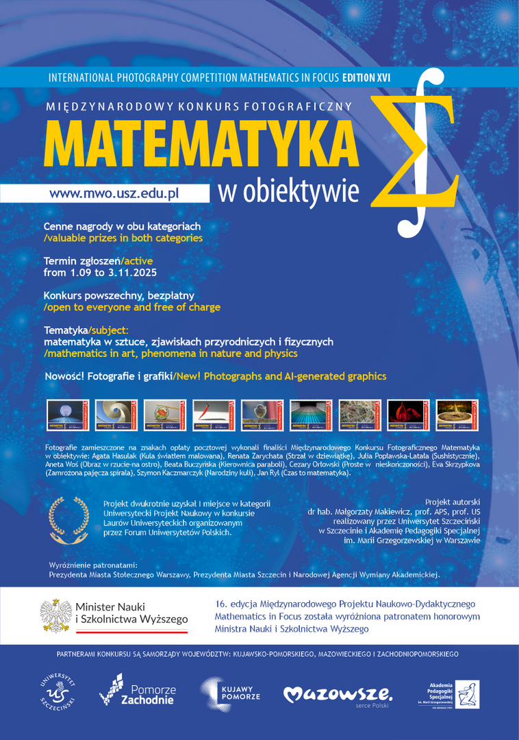 Serdecznie zapraszamy do udziału w XVI edycji międzynarodowego konkursu fotograficznego Matematyka w obiektywie ( szczegóły na załączonym plakacie). Konkurs Matematyka w obiektywie jest częścią międzynarodowego projektu naukowo – dydaktycznego MATHEMATICS IN FOCUS. Organizatorami konkursu są: Uniwersytet Szczecińskie i Akademia Pedagogiki Specjalnej im Marii Grzegorzewskiej w Warszawie