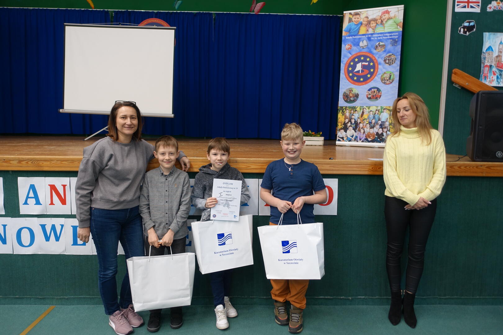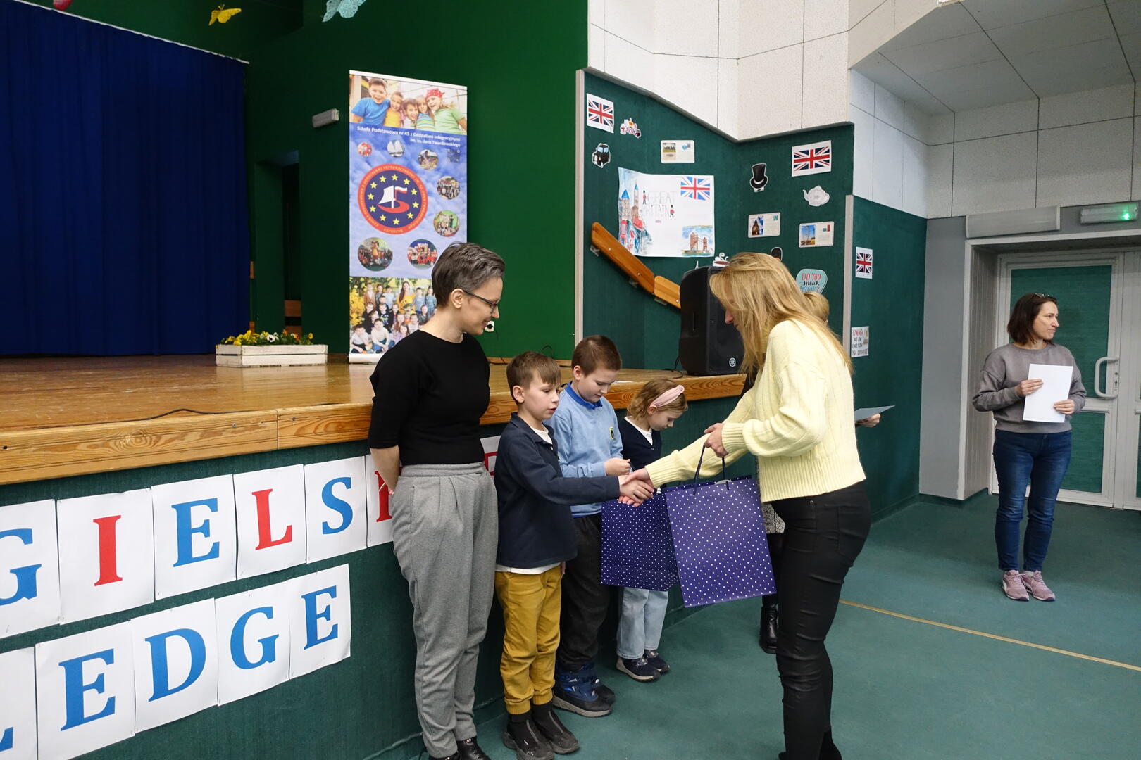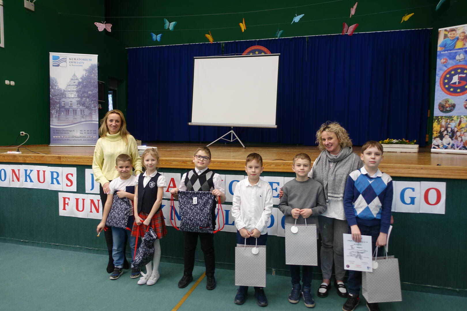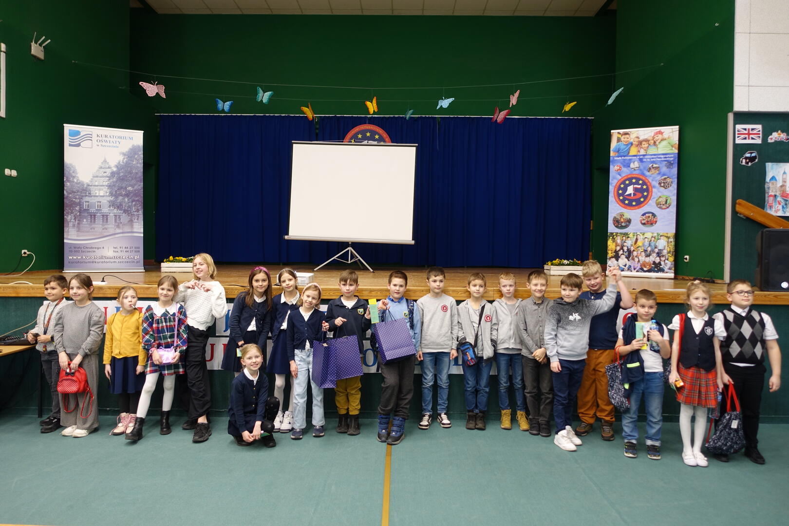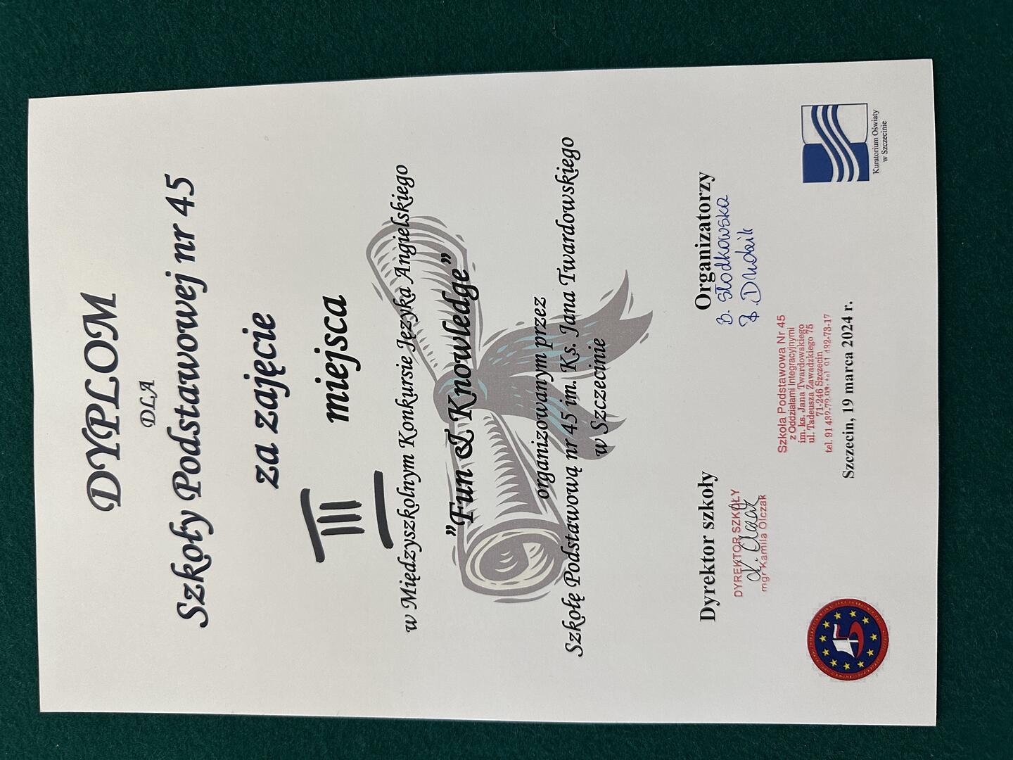 19 marca, we wtorek w naszej szkole odbyła się III edycja Międzyszkolnego Konkursu Języka Angielskiego ”Fun&Knowledge” dla uczniów klas 2 i 3. Po raz pierwszy konkurs został objęty Honorowym Patronatem Zachodniopomorskiego Kuratora Oświaty. Celem konkursu było rozwijanie talentów oraz umiejętności językowych. W konkursie wzięło udział 9 Szkół Podstawowych. I miejsce zajęła Szkoła Podstawowa nr 59 II miejsce zajęła Publiczna Szkoła Podstawowa w Bezrzeczu III miejsce zajęła ex aequo Szkoła Podstawowa nr 45 oraz Szkoła Podstawowa nr 14 Naszą Szkołę reprezentowała drużyna w składzie: Tomasz Schmidt 2c Aleksandra Bogrycewicz 3b Adrian Hordyj 3c Podczas konkursu w części artystycznej zaprezentowała się klasa 3b, którą przygotowała do występu Pani Agnieszka Dybisławska. Młodym anglistom serdecznie gratulujemy i życzymy dalszych sukcesów w poznawaniu tajników języka angielskiego!!!!