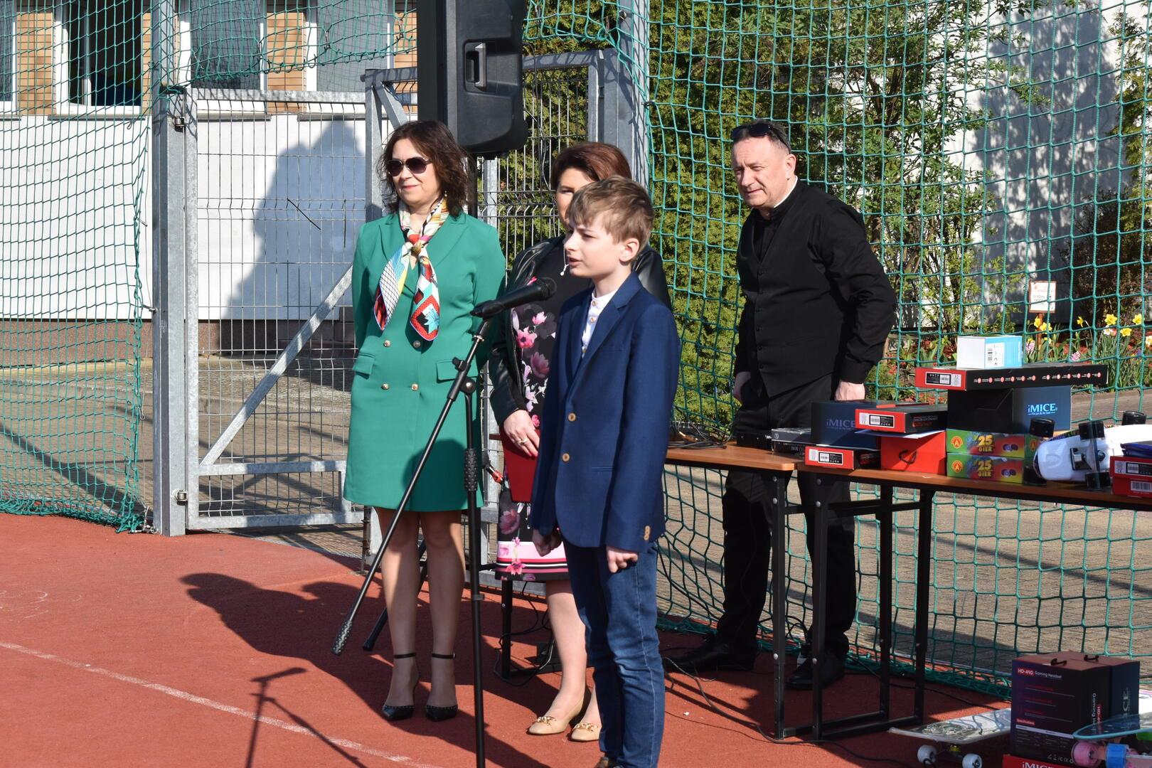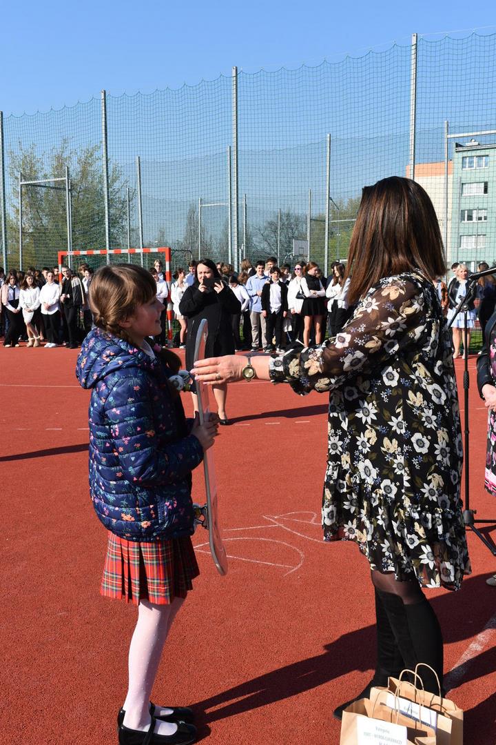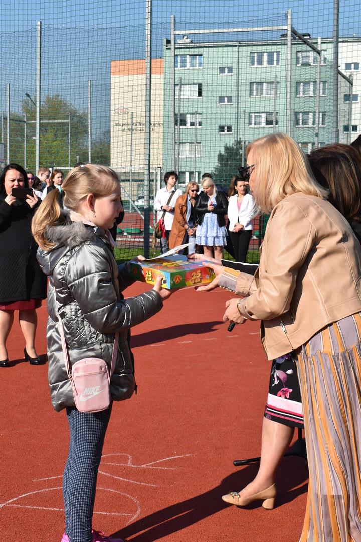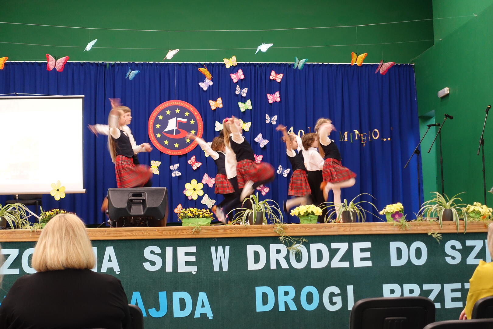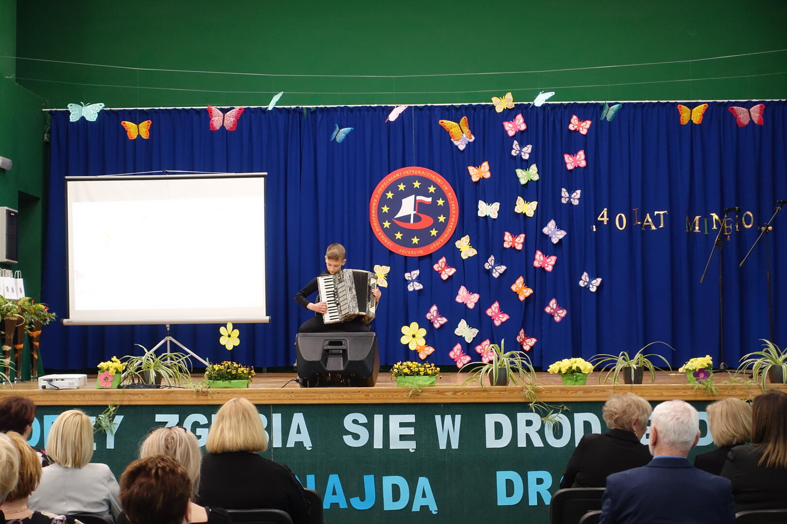 To przede wszystkim nasi uczniowie sprawili, że cieszyliśmy się tym wyjątkowym dniem. Mogliśmy podziwiać niesamowite taneczne występy naszych absolwentów, grę na akordeonie i flażoletach naszych najmłodszych uczniów; nie zabrakło również włoskich muzycznych akcentów. Swoją grą aktorską oczarowała nas klasa 7b, która zaprezentowała spektakl traktujący o szczęściu. Na szkolnym boisku wyjątkowo, bo wypuszczeniem w niebo czterdziestu kolorowych balonów, uczciliśmy ten niezwykły jubileusz szkoły.