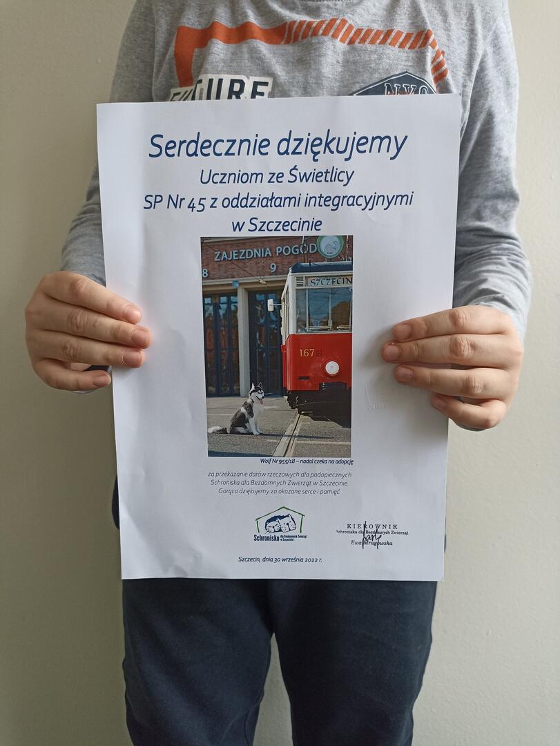 Świetlica szkolna w dniach 19.09-7.10 zorganizowała w szkole zbiórkę darów dla bezdomnych zwierząt. Zebrano żywność, pościele oraz akcesoria dla psów i kotów, by nadchodząca zima była dla nich łatwiejsza. Uczniowie, przynosząc karmę, smakołyki, koce, poduszki, środki czystości i akcesoria wsparli bezdomne zwierzęta w okresie największego zapotrzebowania. Zebrane artykuły zostały przekazane dla Schroniska dla Bezdomnych Zwierząt w Szczecinie. Za przekazanie darów rzeczowych dla podopiecznych, uczniowie otrzymali podziękowania w formie pamiątkowego dyplomu.
