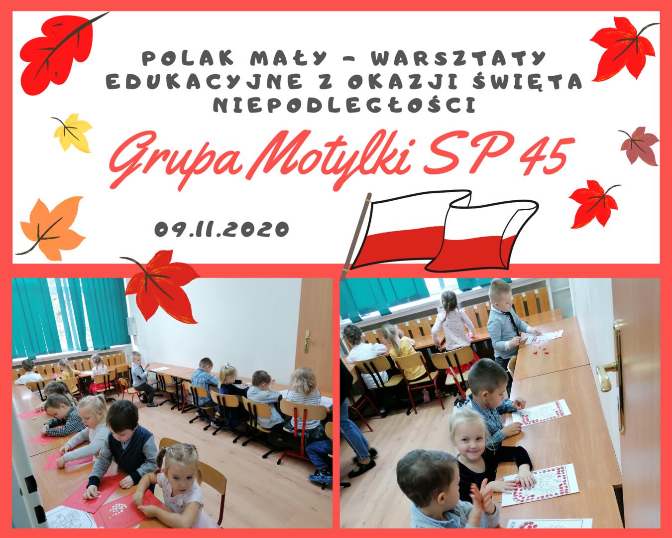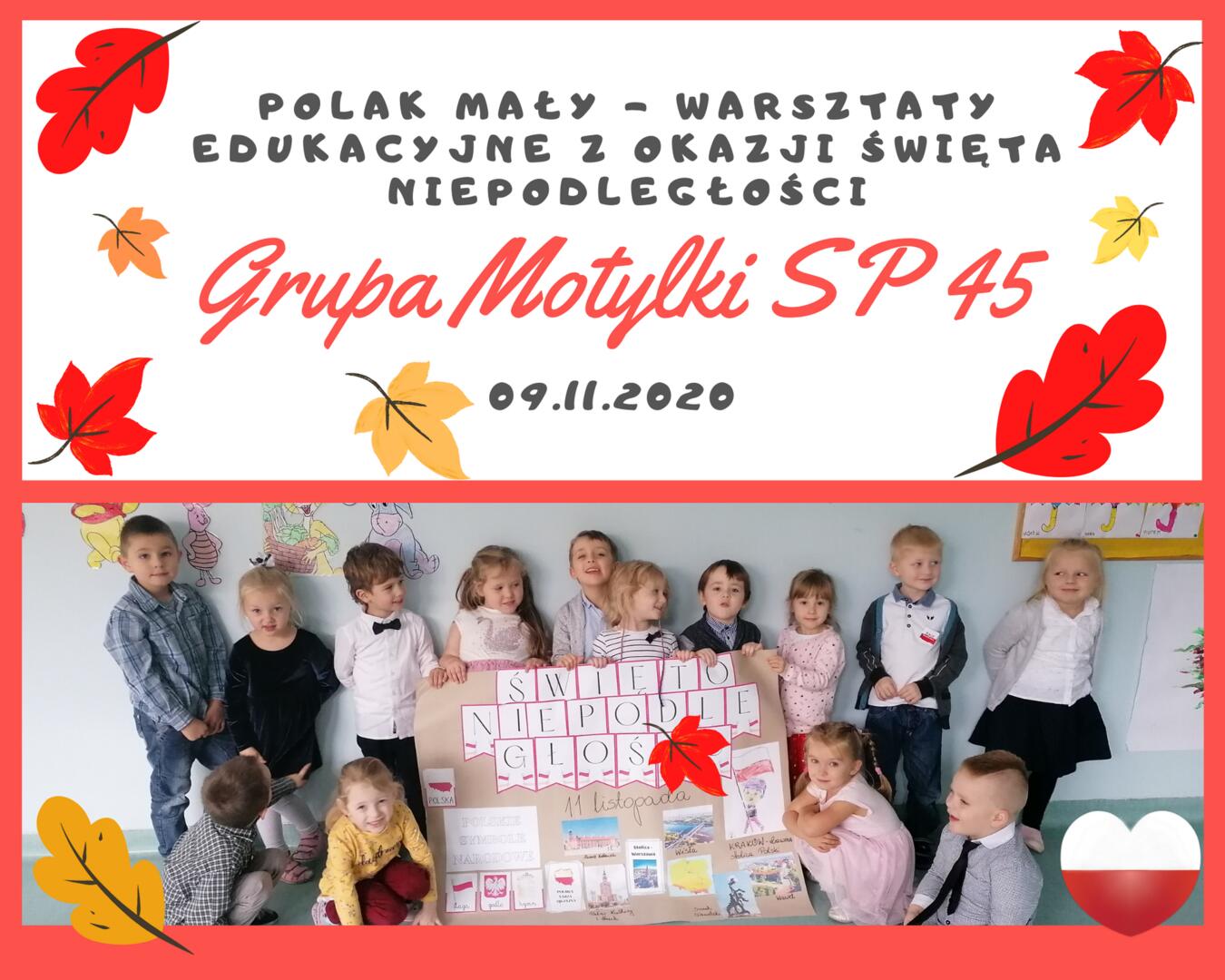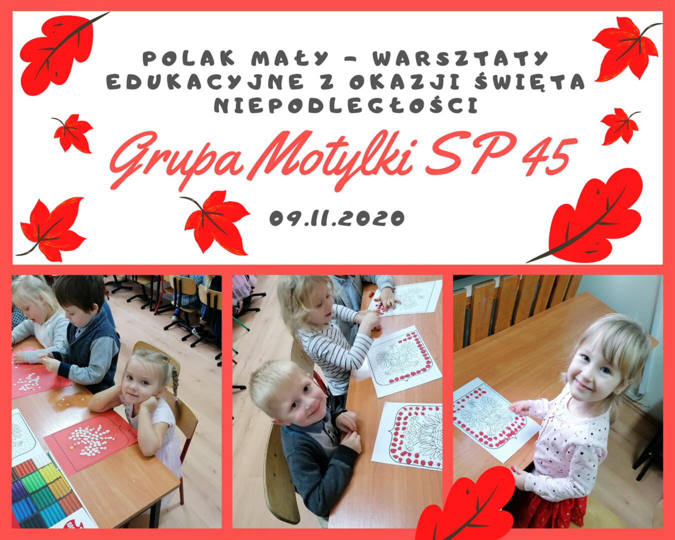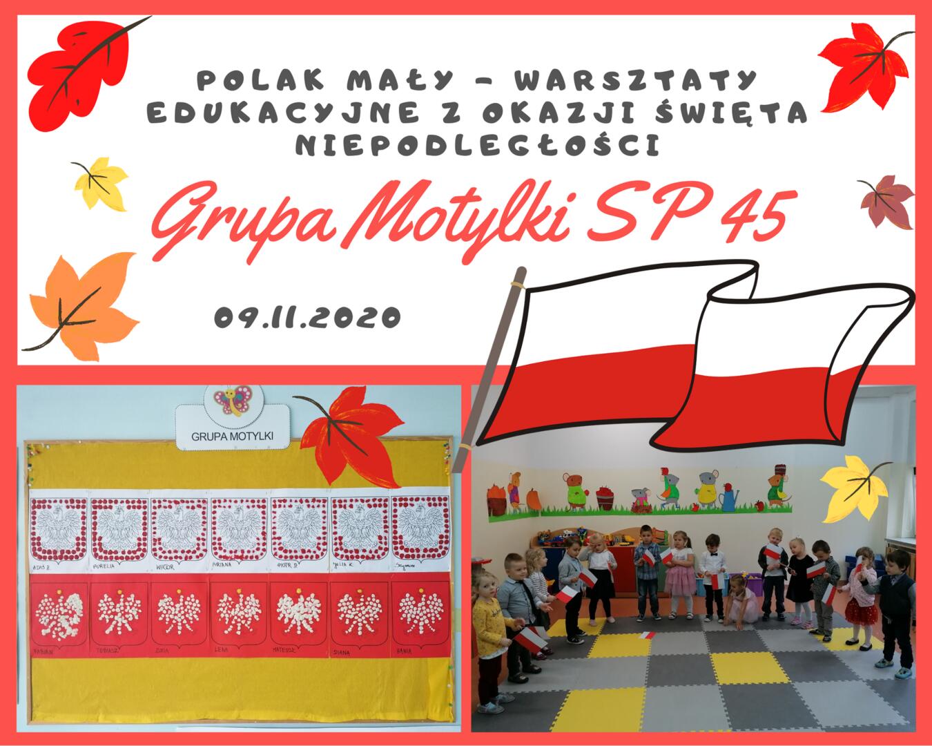 9 listopada w grupie Motylki odbyły się z okazji nadchodzącego Święta Niepodległości - warsztaty edukacyjne pod tytułem "Polak Mały". Przedszkolaki dzięki Pani Adriannie od rytmiki nauczyły się i zaprezentowały układ taneczny "Poleczkę". Następnie dzieci zaśpiewały piosenkę "Jesteśmy Polką i Polakiem". Motylki wspólnie z Panią Eweliną wykonały plakat i nauczyły się rozpoznawać polskie symbole narodowe oraz nauczyły się hymnu "Mazurka Dąbrowskiego". Dzieci poznały również kilka ciekawych informacji o Polsce. Na zakończenie wyklejały plasteliną godło Polski. Poniżej filmiki z udziałem wspaniałych przedszkolaków oraz krótka fotorelacja z warsztatów.