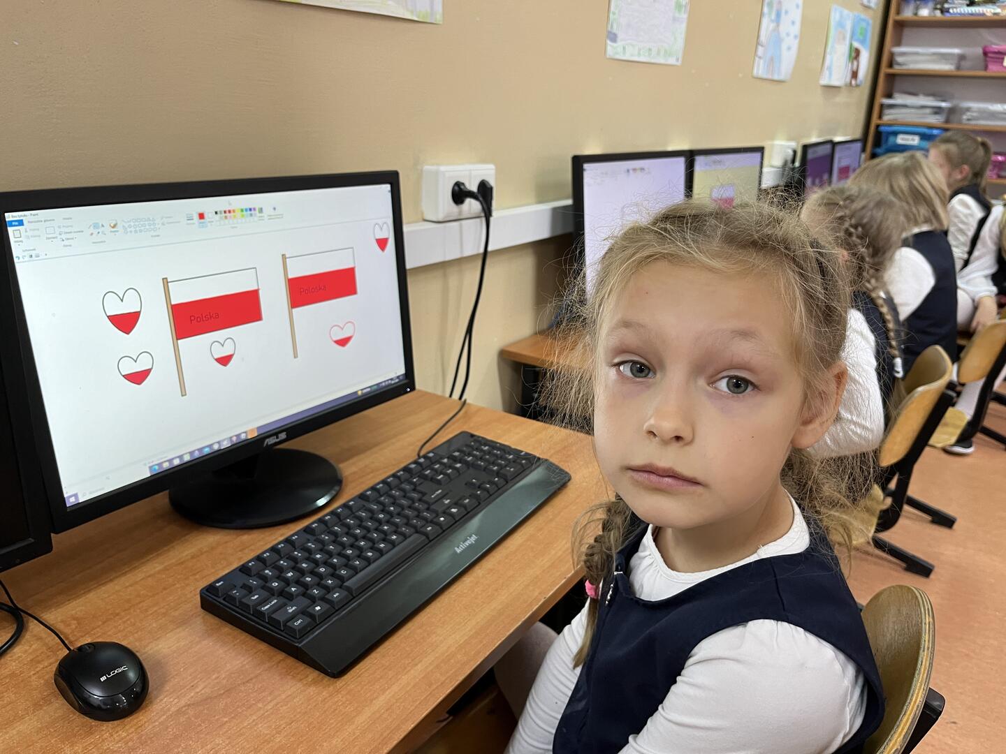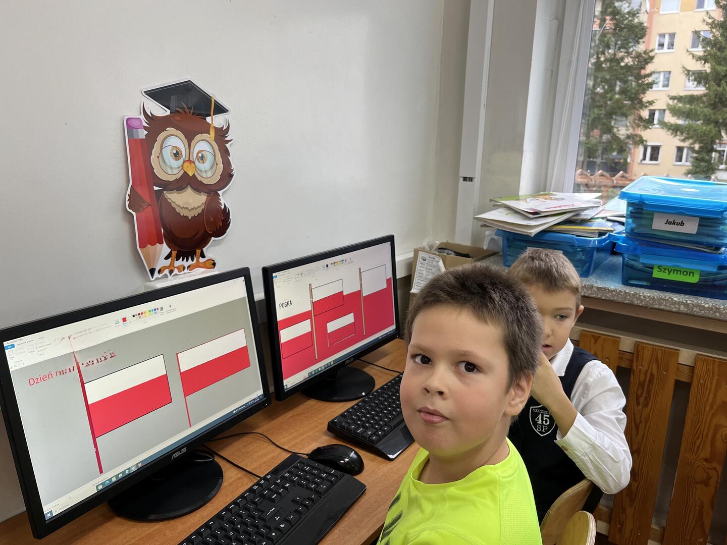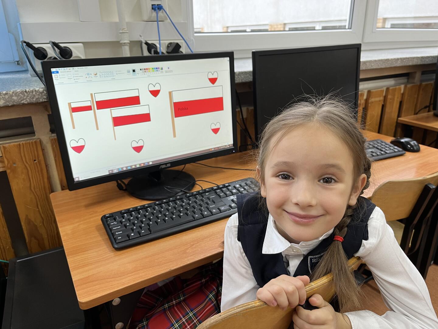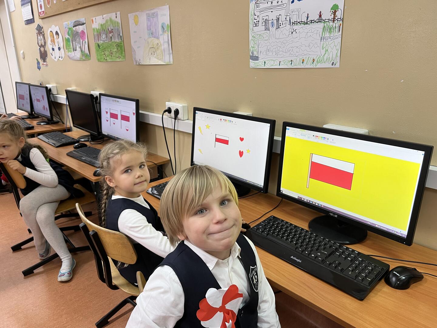 Uczennice i uczniowie klasy 1 b przygotowywali się do obchodów Święta Niepodległości kilka dni wcześniej. W czwartek na edukacji polonistycznej wysłuchały pogadanki i obejrzały film w ramach lekcji patriotyzmu. Na edukacji plastycznej samodzielnie wykonały flagę Polski. Był to też dobry moment na przypomnienie o pozostałych symbolach Polski. Dzieci wspólnie śpiewały hymn Polski pamiętając o zachowaniu właściwej postawy oraz kolorowały godło Polski. W piątek z własnoręcznie wykonanymi flagami uczestniczyły w akademii przygotowanej przez trzecioklasistów. Podsumowaniem tego niezwykłego, ważnego dla każdego Polaka Dnia była lekcja informatyki, na której uczennice i uczniowie wykonali tematyczną pracę wykorzystując dotychczas poznane narzędzia edytora grafiki Paint. Coroczna tradycja organizowania w naszej szkole akademii Święta Niepodległości jest wspaniałą okazją kształcenia postaw patriotycznych, przypomnienia trudnej drogi kraju do suwerenności oraz wspólnego świętowania.
