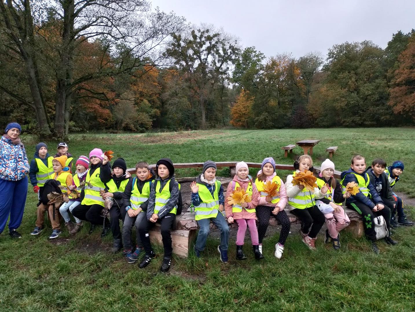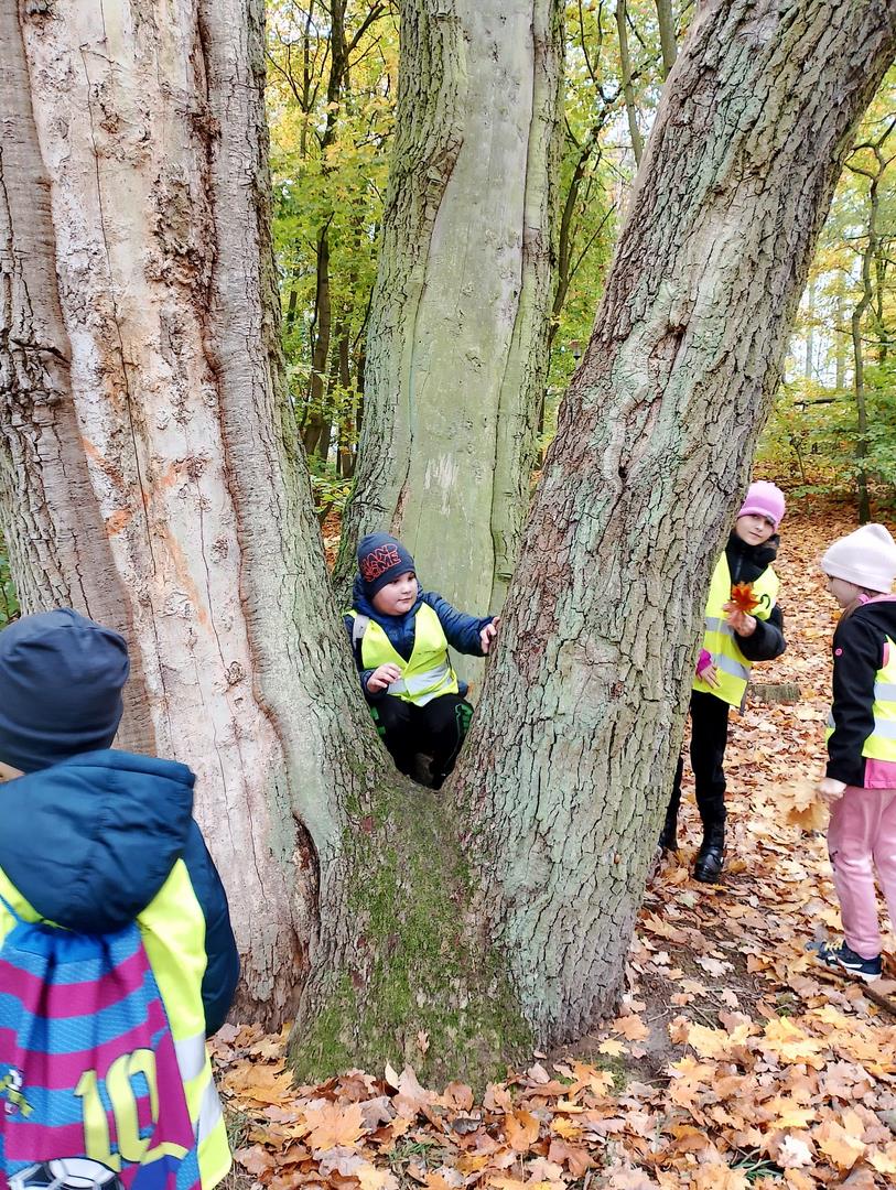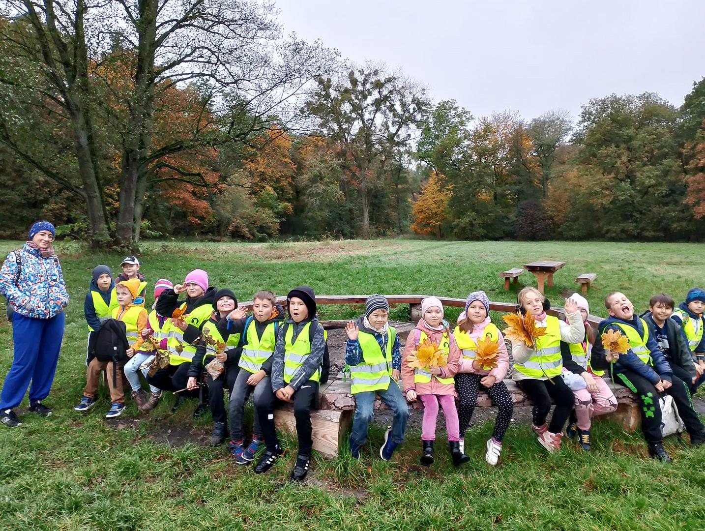 Obserwacja naturalnego świata roślin i zwierząt zapowiadała się interesująco i dzieci nie zawiodły się atrakcyjnością przyrody. Chętnie poznawały las, który kryje w sobie wiele tajemnic. Rozpoznawały różnorodność szaty roślinnej lasu: drzewa liściaste, iglaste, krzewy, mchy i runo leśne. Uczniowie zbierali kolorowe liście znalezione podczas wędrówki, określali koloryt liści za pomocą przymiotników, układali je według barwy