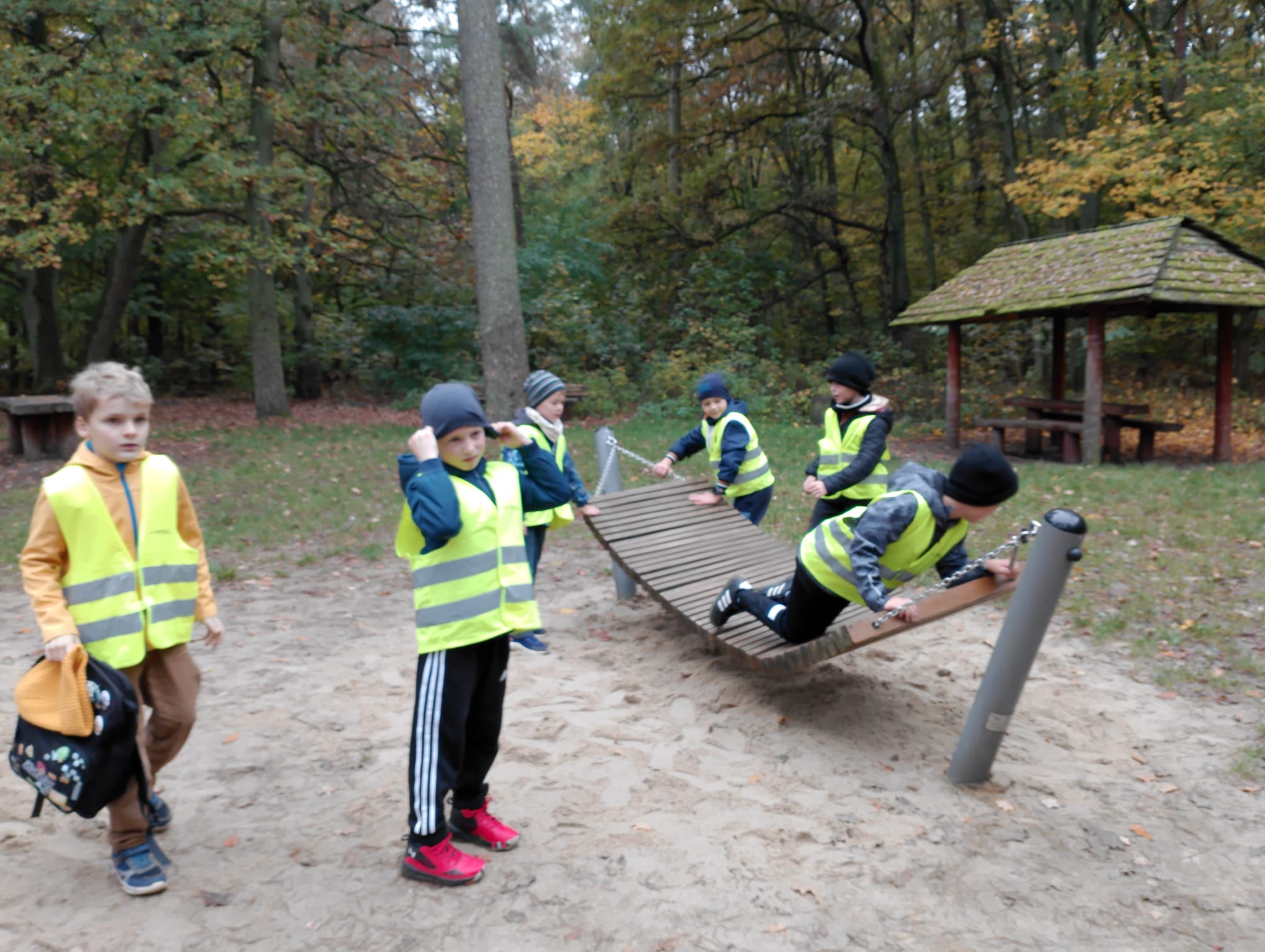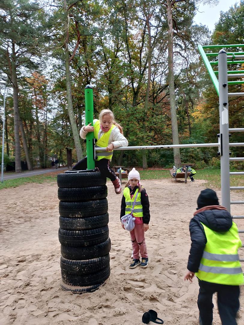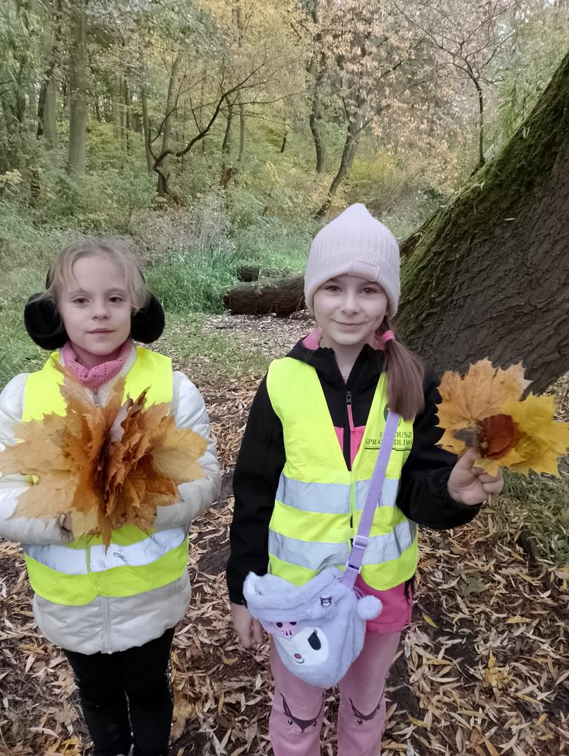 Obserwacja naturalnego świata roślin i zwierząt zapowiadała się interesująco i dzieci nie zawiodły się atrakcyjnością przyrody. Chętnie poznawały las, który kryje w sobie wiele tajemnic. Rozpoznawały różnorodność szaty roślinnej lasu: drzewa liściaste, iglaste, krzewy, mchy i runo leśne. Uczniowie zbierali kolorowe liście znalezione podczas wędrówki, określali koloryt liści za pomocą przymiotników, układali je według barwy