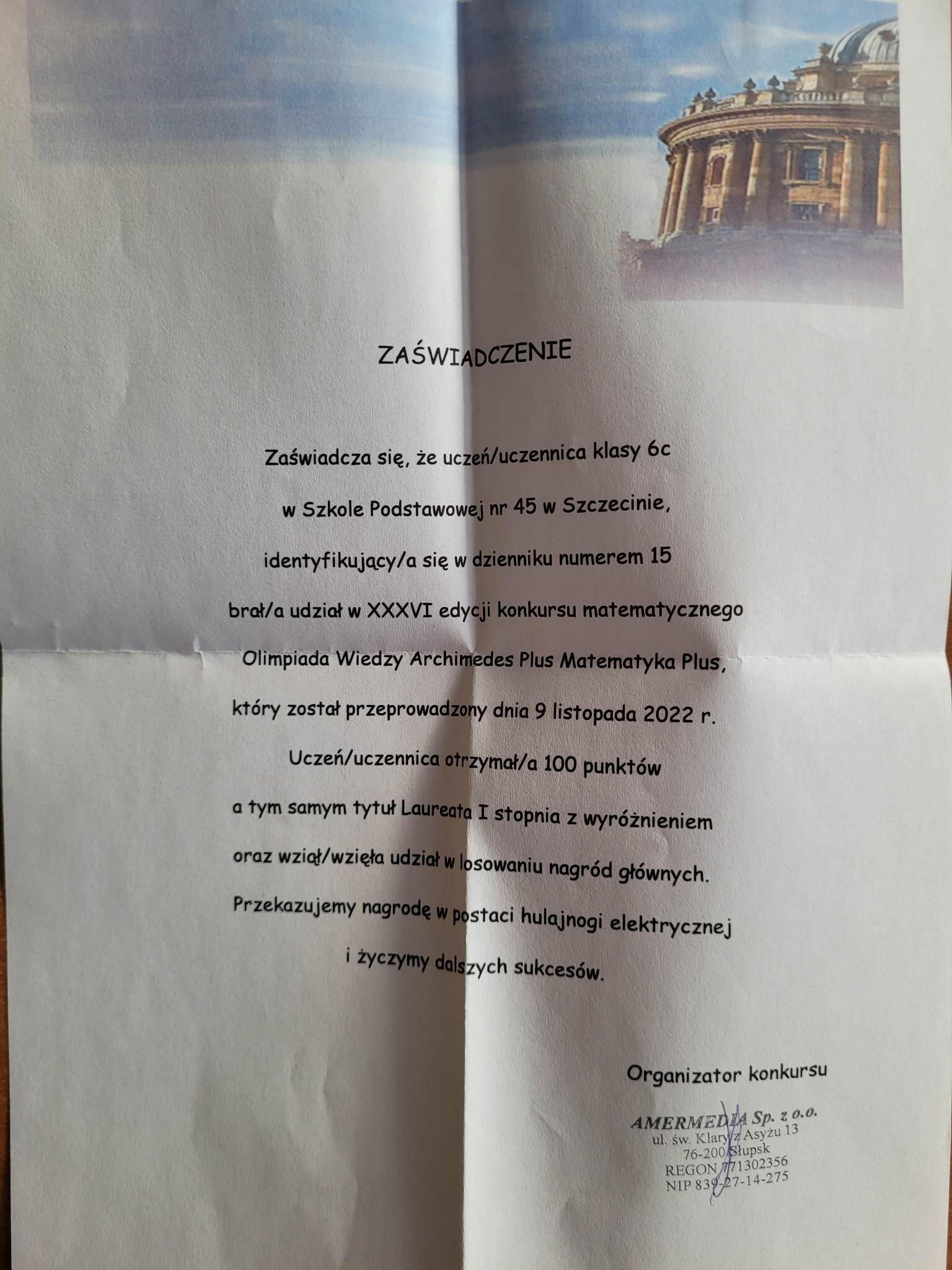 Uczeń klasy 6c Filip Paderecki zbobyl tylul laureata I stopnia w konkursie matematycznym Olimpiada Wiedzy Archimiedes Plus.